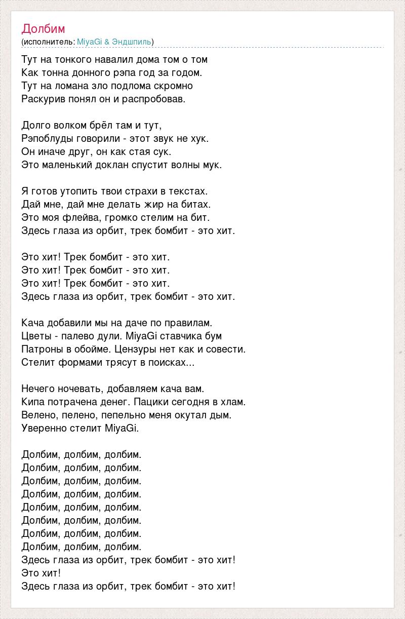 Тут на тонкого навалил дома том о том Как тонна донного рэпа год за годом. Тут на ломана зло подлома скромно Раскурив понял он и распробовав. Долго волком брёл там и тут, Рэпоблуды говорили - этот звук не хук. Он иначе друг, он как стая сук. Это маленький доклан спустит волны мук. Я готов утопить твои страхи в текстах. Дай мне, дай мне делать жир на битах. Это моя флейва, громко стелим на бит. Здесь глаза из орбит, трек бомбит - это хит. Это хит! Трек бомбит - это хит. Это хит! Трек бомбит - это хит. Это хит! Трек бомбит - это хит. Здесь глаза из орбит, трек бомбит - это хит. Кача добавили мы на даче по правилам. Цветы - палево дули. MiyaGi ставчика бум Патроны в обойме. Цензуры нет как и совести. Стелит формами трясут в поисках... Нечего ночевать, добавляем кача вам. Кипа потрачена денег. Пацики сегодня в хлам. Велено, пелено, пепельно меня окутал дым. Уверенно стелит MiyaGi. Долбим, долбим, долбим. Долбим, долбим, долбим. Долбим, долбим, долбим. Долбим, долбим, долбим. Долбим, долбим, долбим. Долбим, долбим, долбим. Долбим, долбим, долбим. Долбим, долбим, долбим. Здесь глаза из орбит, трек бомбит - это хит! Это хит! Здесь глаза из орбит, трек бомбит - это хит!