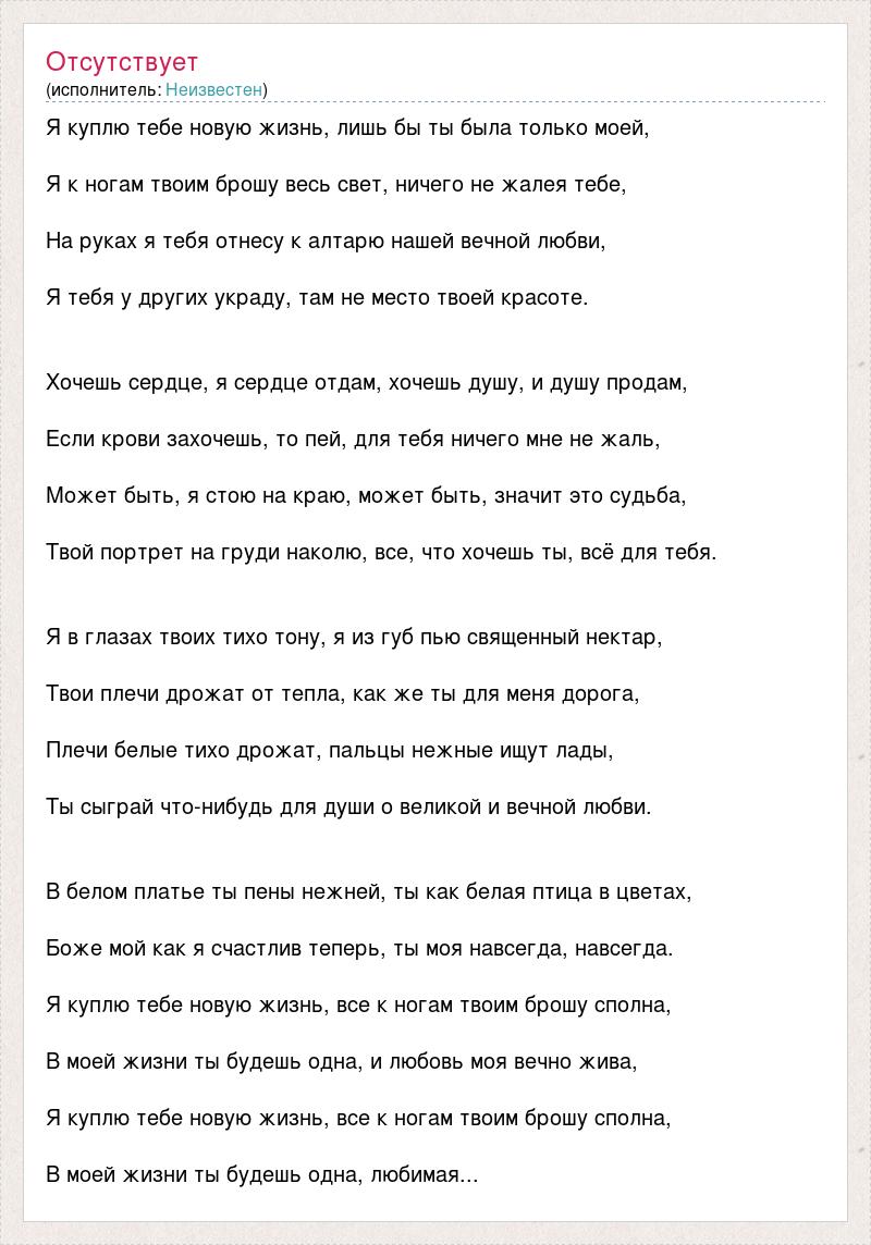 Я куплю тебе новую жизнь, лишь бы ты была только моей, Я к ногам твоим брошу весь свет, ничего не жалея тебе, На руках я тебя отнесу к алтарю нашей вечной любви, Я тебя у других украду, там не место твоей красоте. Хочешь сердце, я сердце отдам, хочешь душу, и душу продам, Если крови захочешь, то пей, для тебя ничего мне не жаль, Может быть, я стою на краю, может быть, значит это судьба, Твой портрет на груди наколю, все, что хочешь ты, всё для тебя. Я в глазах твоих тихо тону, я из губ пью священный нектар, Твои плечи дрожат от тепла, как же ты для меня дорога, Плечи белые тихо дрожат, пальцы нежные ищут лады, Ты сыграй что-нибудь для души о великой и вечной любви. В белом платье ты пены нежней, ты как белая птица в цветах, Боже мой как я счастлив теперь, ты моя навсегда, навсегда. Я куплю тебе новую жизнь, все к ногам твоим брошу сполна, В моей жизни ты будешь одна, и любовь моя вечно жива, Я куплю тебе новую жизнь, все к ногам твоим брошу сполна, В моей жизни ты будешь одна, любимая...