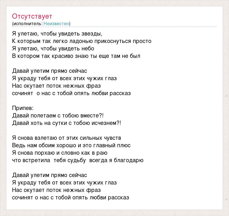 Я улетаю, чтобы увидеть звезды, К которым так легко ладонью прикоснуться просто Я улетаю, чтобы увидеть небо В котором так красиво знаю ты еще там не был Давай улетим прямо сейчас Я украду тебя от всех этих чужих глаз Нас окутает поток нежных фраз сочинят о нас с тобой опять любви рассказ Припев: Давай полетаем с тобою вместе?! Давай хоть на сутки с тобою исчезнем?! Я снова взлетаю от этих сильных чувств Ведь нам обоим хорошо и это главный плюс Я снова порхаю и словно как в раю что встретила тебя судьбу всегда я благодарю Давай улетим прямо сейчас Я украду тебя от всех этих чужих глаз Нас окутает поток нежных фраз сочинят о нас с тобой опять любви рассказ