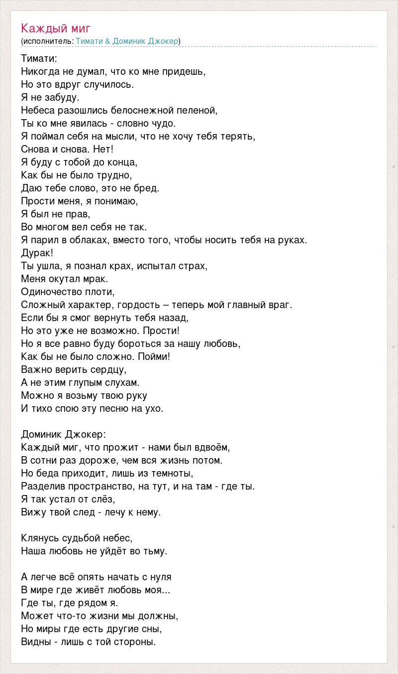 Тимати: Никогда не думал, что ко мне придешь, Но это вдруг случилось. Я не забуду. Небеса разошлись белоснежной пеленой, Ты ко мне явилась - словно чудо. Я поймал себя на мысли, что не хочу тебя терять, Снова и снова. Нет! Я буду с тобой до конца, Как бы не было трудно, Даю тебе слово, это не бред. Прости меня, я понимаю, Я был не прав, Во многом вел себя не так. Я парил в облаках, вместо того, чтобы носить тебя на руках. Дурак! Ты ушла, я познал крах, испытал страх, Меня окутал мрак. Одиночество плоти, Сложный характер, гордость – теперь мой главный враг. Если бы я смог вернуть тебя назад, Но это уже не возможно. Прости! Но я все равно буду бороться за нашу любовь, Как бы не было сложно. Пойми! Важно верить сердцу, А не этим глупым слухам. Можно я возьму твою руку И тихо спою эту песню на ухо. Доминик Джокер: Каждый миг, что прожит - нами был вдвоём, В сотни раз дороже, чем вся жизнь потом. Но беда приходит, лишь из темноты, Разделив пространство, на тут, и на там - где ты. Я так устал от слёз, Вижу твой след - лечу к нему. Клянусь судьбой небес, Наша любовь не уйдёт во тьму. А легче всё опять начать с нуля В мире где живёт любовь моя... Где ты, где рядом я. Может что-то жизни мы должны, Но миры где есть другие сны, Видны - лишь с той стороны.