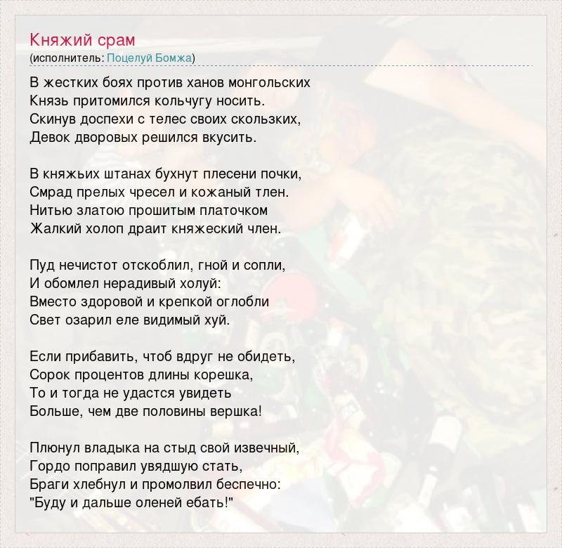 В жестких боях против ханов монгольских Князь притомился кольчугу носить. Скинув доспехи с телес своих скользких, Девок дворовых решился вкусить. В княжьих штанах бухнут плесени почки, Смрад прелых чресел и кожаный тлен. Нитью златою прошитым платочком Жалкий холоп драит княжеский член. Пуд нечистот отскоблил, гной и сопли, И обомлел нерадивый холуй: Вместо здоровой и крепкой оглобли Свет озарил еле видимый хуй. Если прибавить, чтоб вдруг не обидеть, Сорок процентов длины корешка, То и тогда не удастся увидеть Больше, чем две половины вершка! Плюнул владыка на стыд свой извечный, Гордо поправил увядшую стать, Браги хлебнул и промолвил беспечно: "Буду и дальше оленей ебать!"
