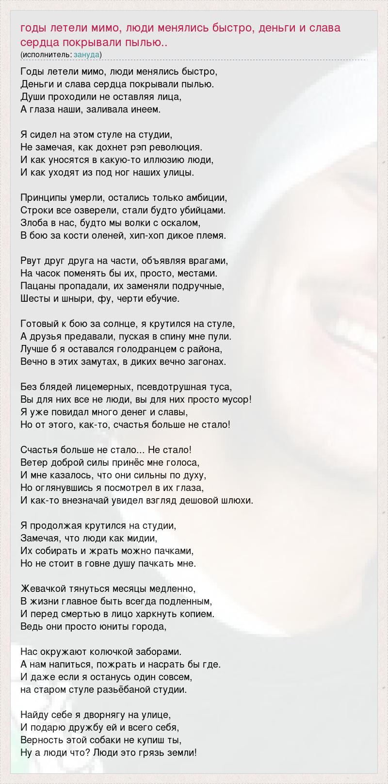 Годы летели мимо, люди менялись быстро, Деньги и слава сердца покрывали пылью. Души проходили не оставляя лица, А глаза наши, заливала инеем. Я сидел на этом стуле на студии, Не замечая, как дохнет рэп революция. И как уносятся в какую-то иллюзию люди, И как уходят из под ног наших улицы. Принципы умерли, остались только амбиции, Строки все озверели, стали будто убийцами. Злоба в нас, будто мы волки с оскалом, В бою за кости оленей, хип-хоп дикое племя. Рвут друг друга на части, объявляя врагами, На часок поменять бы их, просто, местами. Пацаны пропадали, их заменяли подручные, Шесты и шныри, фу, черти ебучие. Готовый к бою за солнце, я крутился на стуле, А друзья предавали, пуская в спину мне пули. Лучше б я оставался голодранцем с района, Вечно в этих замутах, в диких вечно загонах. Без блядей лицемерных, псевдотрушная туса, Вы для них все не люди, вы для них просто мусор! Я уже повидал много денег и славы, Но от этого, как-то, счастья больше не стало! Счастья больше не стало... Не стало! Ветер доброй силы принёс мне голоса, И мне казалось, что они сильны по духу, Но оглянувшись я посмотрел в их глаза, И как-то внезначай увидел взгляд дешовой шлюхи. Я продолжая крутился на студии, Замечая, что люди как мидии, Их собирать и жрать можно пачками, Но не стоит в говне душу пачкать мне. Жевачкой тянуться месяцы медленно, В жизни главное быть всегда подленным, И перед смертью в лицо харкнуть копием. Ведь они просто юниты города, Нас окружают колючкой заборами. А нам напиться, пожрать и насрать бы где. И даже если я останусь один совсем, на старом стуле разьёбаной студии. Найду себе я дворнягу на улице, И подарю дружбу ей и всего себя, Верность этой собаки не купиш ты, Ну а люди что? Люди это грязь земли!