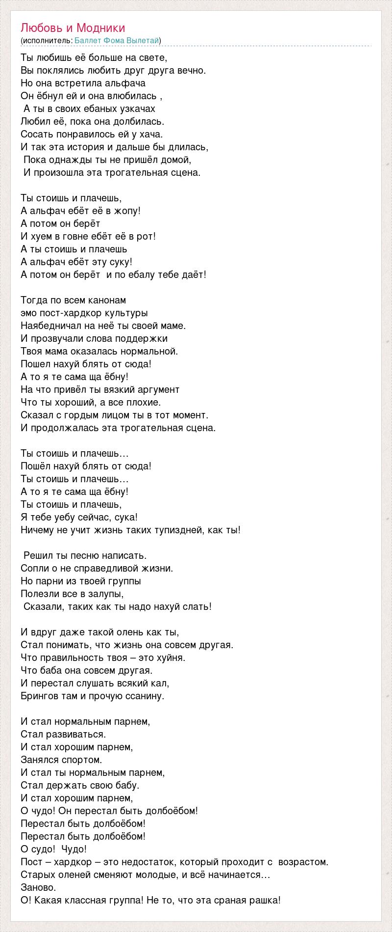 Ты любишь её больше на свете, Вы поклялись любить друг друга вечно. Но она встретила альфача Он ёбнул ей и она влюбилась , А ты в своих ебаных узкачах Любил её, пока она долбилась. Сосать понравилось ей у хача. И так эта история и дальше бы длилась, Пока однажды ты не пришёл домой, И произошла эта трогательная сцена. Ты стоишь и плачешь, А альфач ебёт её в жопу! А потом он берёт И хуем в говне ебёт её в рот! А ты стоишь и плачешь А альфач ебёт эту суку! А потом он берёт и по ебалу тебе даёт! Тогда по всем канонам эмо пост-хардкор культуры Наябедничал на неё ты своей маме. И прозвучали слова поддержки Твоя мама оказалась нормальной. Пошел нахуй блять от сюда! А то я те сама ща ёбну! На что привёл ты вязкий аргумент Что ты хороший, а все плохие. Сказал с гордым лицом ты в тот момент. И продолжалась эта трогательная сцена. Ты стоишь и плачешь… Пошёл нахуй блять от сюда! Ты стоишь и плачешь… А то я те сама ща ёбну! Ты стоишь и плачешь, Я тебе уебу сейчас, сука! Ничему не учит жизнь таких тупиздней, как ты! Решил ты песню написать. Сопли о не справедливой жизни. Но парни из твоей группы Полезли все в залупы, Сказали, таких как ты надо нахуй слать! И вдруг даже такой олень как ты, Стал понимать, что жизнь она совсем другая. Что правильность твоя – это хуйня. Что баба она совсем другая. И перестал слушать всякий кал, Брингов там и прочую ссанину. И стал нормальным парнем, Стал развиваться. И стал хорошим парнем, Занялся спортом. И стал ты нормальным парнем, Стал держать свою бабу. И стал хорошим парнем, О чудо! Он перестал быть долбоёбом! Перестал быть долбоёбом! Перестал быть долбоёбом! О судо! Чудо! Пост – хардкор – это недостаток, который проходит с возрастом. Старых оленей сменяют молодые, и всё начинается… Заново. О! Какая классная группа! Не то, что эта сраная рашка!