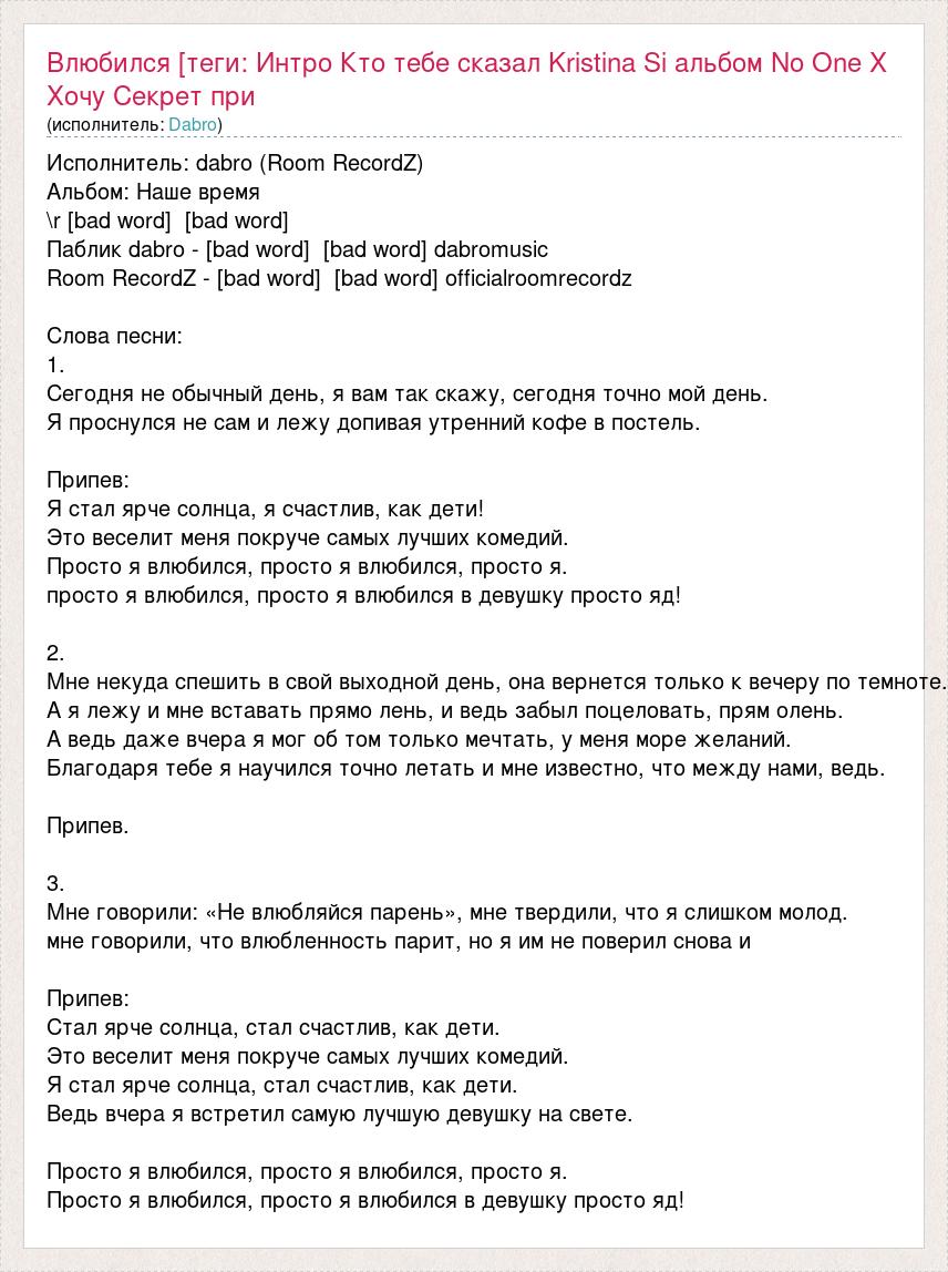 Исполнитель: dabro (Room RecordZ) Альбом: Наше время [bad word] [bad word] Паблик dabro - [bad word] [bad word] dabromusic Room RecordZ - [bad word] [bad word] officialroomrecordz Слова песни: 1. Сегодня не обычный день, я вам так скажу, сегодня точно мой день. Я проснулся не сам и лежу допивая утренний кофе в постель. Припев: Я стал ярче солнца, я счастлив, как дети! Это веселит меня покруче самых лучших комедий. Просто я влюбился, просто я влюбился, просто я. просто я влюбился, просто я влюбился в девушку просто яд! 2. Мне некуда спешить в свой выходной день, она вернется только к вечеру по темноте. А я лежу и мне вставать прямо лень, и ведь забыл поцеловать, прям олень. А ведь даже вчера я мог об том только мечтать, у меня море желаний. Благодаря тебе я научился точно летать и мне известно, что между нами, ведь. Припев. 3. Мне говорили: «Не влюбляйся парень», мне твердили, что я слишком молод. мне говорили, что влюбленность парит, но я им не поверил снова и Припев: Стал ярче солнца, стал счастлив, как дети. Это веселит меня покруче самых лучших комедий. Я стал ярче солнца, стал счастлив, как дети. Ведь вчера я встретил самую лучшую девушку на свете. Просто я влюбился, просто я влюбился, просто я. Просто я влюбился, просто я влюбился в девушку просто яд!