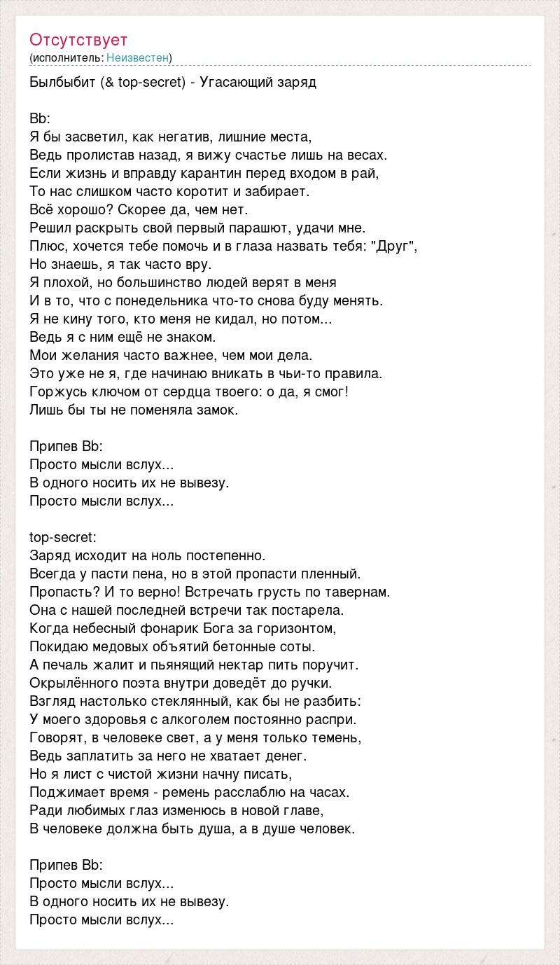 Былбыбит (& top-secret) - Угасающий заряд Bb: Я бы засветил, как негатив, лишние места, Ведь пролистав назад, я вижу счастье лишь на весах. Если жизнь и вправду карантин перед входом в рай, То нас слишком часто коротит и забирает. Всё хорошо? Скорее да, чем нет. Решил раскрыть свой первый парашют, удачи мне. Плюс, хочется тебе помочь и в глаза назвать тебя: "Друг", Но знаешь, я так часто вру. Я плохой, но большинство людей верят в меня И в то, что с понедельника что-то снова буду менять. Я не кину того, кто меня не кидал, но потом... Ведь я с ним ещё не знаком. Мои желания часто важнее, чем мои дела. Это уже не я, где начинаю вникать в чьи-то правила. Горжусь ключом от сердца твоего: о да, я смог! Лишь бы ты не поменяла замок. Припев Bb: Просто мысли вслух... В одного носить их не вывезу. Просто мысли вслух... top-secret: Заряд исходит на ноль постепенно. Всегда у пасти пена, но в этой пропасти пленный. Пропасть? И то верно! Встречать грусть по тавернам. Она с нашей последней встречи так постарела. Когда небесный фонарик Бога за горизонтом, Покидаю медовых объятий бетонные соты. А печаль жалит и пьянящий нектар пить поручит. Окрылённого поэта внутри доведёт до ручки. Взгляд настолько стеклянный, как бы не разбить: У моего здоровья с алкоголем постоянно распри. Говорят, в человеке свет, а у меня только темень, Ведь заплатить за него не хватает денег. Но я лист с чистой жизни начну писать, Поджимает время - ремень расслаблю на часах. Ради любимых глаз изменюсь в новой главе, В человеке должна быть душа, а в душе человек. Припев Bb: Просто мысли вслух... В одного носить их не вывезу. Просто мысли вслух...