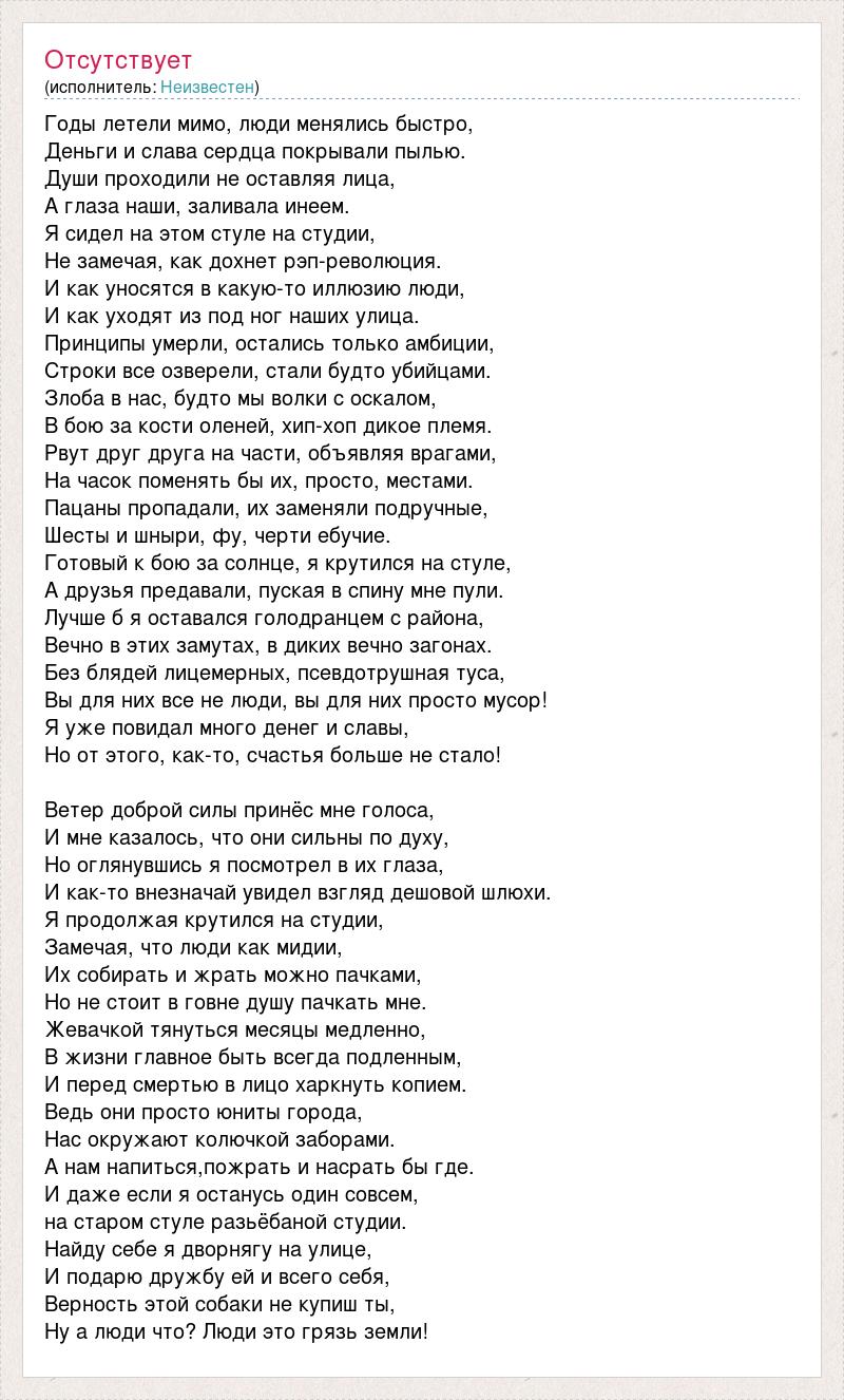 Годы летели мимо, люди менялись быстро, Деньги и слава сердца покрывали пылью. Души проходили не оставляя лица, А глаза наши, заливала инеем. Я сидел на этом стуле на студии, Не замечая, как дохнет рэп-революция. И как уносятся в какую-то иллюзию люди, И как уходят из под ног наших улица. Принципы умерли, остались только амбиции, Строки все озверели, стали будто убийцами. Злоба в нас, будто мы волки с оскалом, В бою за кости оленей, хип-хоп дикое племя. Рвут друг друга на части, объявляя врагами, На часок поменять бы их, просто, местами. Пацаны пропадали, их заменяли подручные, Шесты и шныри, фу, черти ебучие. Готовый к бою за солнце, я крутился на стуле, А друзья предавали, пуская в спину мне пули. Лучше б я оставался голодранцем с района, Вечно в этих замутах, в диких вечно загонах. Без блядей лицемерных, псевдотрушная туса, Вы для них все не люди, вы для них просто мусор! Я уже повидал много денег и славы, Но от этого, как-то, счастья больше не стало! Ветер доброй силы принёс мне голоса, И мне казалось, что они сильны по духу, Но оглянувшись я посмотрел в их глаза, И как-то внезначай увидел взгляд дешовой шлюхи. Я продолжая крутился на студии, Замечая, что люди как мидии, Их собирать и жрать можно пачками, Но не стоит в говне душу пачкать мне. Жевачкой тянуться месяцы медленно, В жизни главное быть всегда подленным, И перед смертью в лицо харкнуть копием. Ведь они просто юниты города, Нас окружают колючкой заборами. А нам напиться,пожрать и насрать бы где. И даже если я останусь один совсем, на старом стуле разьёбаной студии. Найду себе я дворнягу на улице, И подарю дружбу ей и всего себя, Верность этой собаки не купиш ты, Ну а люди что? Люди это грязь земли!