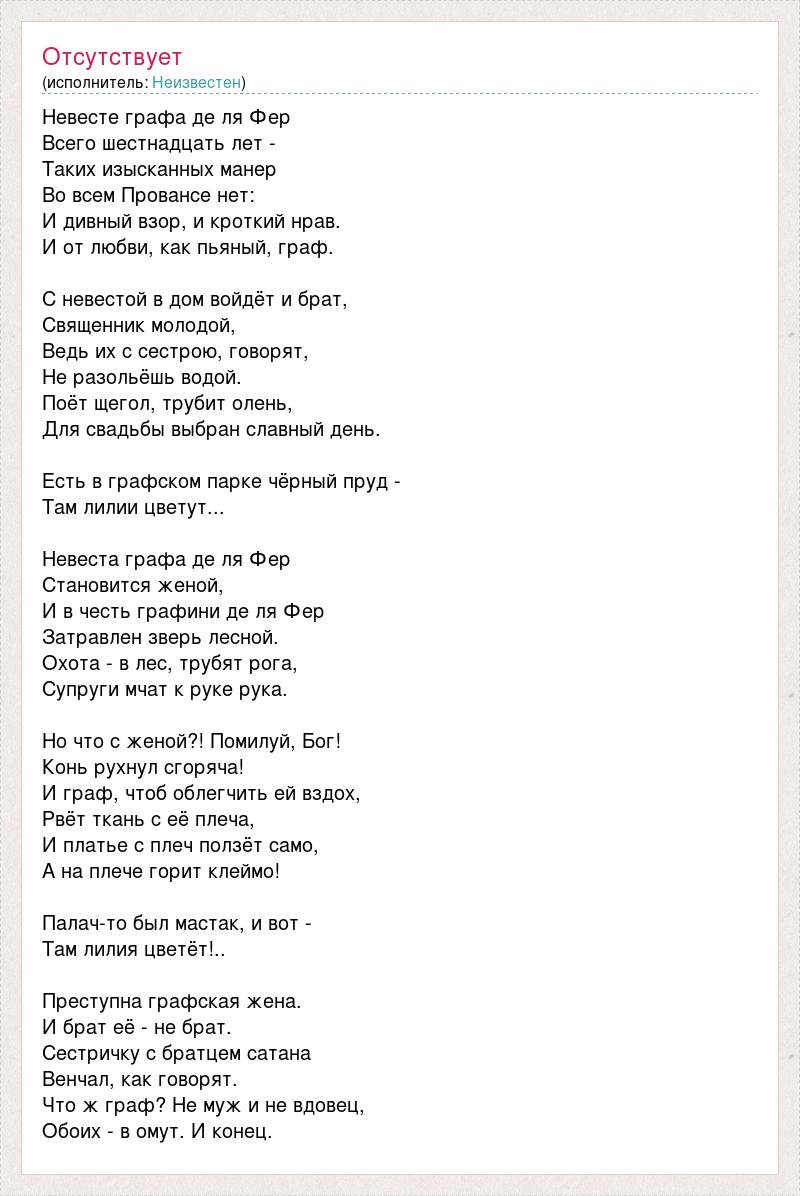 Невесте графа де ля Фер Всего шестнадцать лет - Таких изысканных манер Во всем Провансе нет: И дивный взор, и кроткий нрав. И от любви, как пьяный, граф. С невестой в дом войдёт и брат, Священник молодой, Ведь их с сестрою, говорят, Не разольёшь водой. Поёт щегол, трубит олень, Для свадьбы выбран славный день. Есть в графском парке чёрный пруд - Там лилии цветут... Невеста графа де ля Фер Становится женой, И в честь графини де ля Фер Затравлен зверь лесной. Охота - в лес, трубят рога, Супруги мчат к руке рука. Но что с женой?! Помилуй, Бог! Конь рухнул сгоряча! И граф, чтоб облегчить ей вздох, Рвёт ткань с её плеча, И платье с плеч ползёт само, А на плече горит клеймо! Палач-то был мастак, и вот - Там лилия цветёт!.. Преступна графская жена. И брат её - не брат. Сестричку с братцем сатана Венчал, как говорят. Что ж граф? Не муж и не вдовец, Обоих - в омут. И конец.