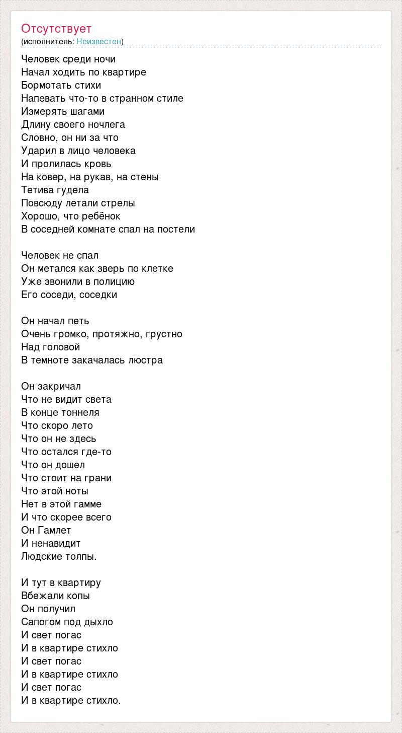 Человек среди ночи Начал ходить по квартире Бормотать стихи Напевать что-то в странном стиле Измерять шагами Длину своего ночлега Словно, он ни за что Ударил в лицо человека И пролилась кровь На ковер, на рукав, на стены Тетива гудела Повсюду летали стрелы Хорошо, что ребёнок В соседней комнате спал на постели Человек не спал Он метался как зверь по клетке Уже звонили в полицию Его соседи, соседки Он начал петь Очень громко, протяжно, грустно Над головой В темноте закачалась люстра Он закричал Что не видит света В конце тоннеля Что скоро лето Что он не здесь Что остался где-то Что он дошел Что стоит на грани Что этой ноты Нет в этой гамме И что скорее всего Он Гамлет И ненавидит Людские толпы. И тут в квартиру Вбежали копы Он получил Сапогом под дыхло И свет погас И в квартире стихло И свет погас И в квартире стихло И свет погас И в квартире стихло.