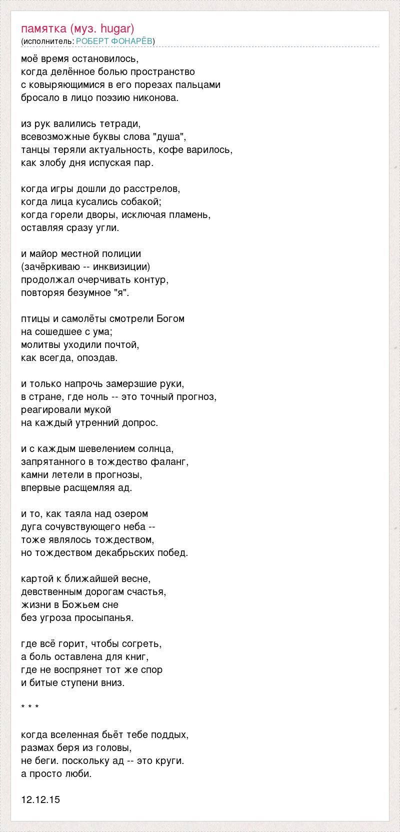 моё время остановилось, когда делённое болью пространство с ковыряющимися в его порезах пальцами бросало в лицо поэзию никонова. из рук валились тетради, всевозможные буквы слова "душа", танцы теряли актуальность, кофе варилось, как злобу дня испуская пар. когда игры дошли до расстрелов, когда лица кусались собакой; когда горели дворы, исключая пламень, оставляя сразу угли. и майор местной полиции (зачёркиваю -- инквизиции) продолжал очерчивать контур, повторяя безумное "я". птицы и самолёты смотрели Богом на сошедшее с ума; молитвы уходили почтой, как всегда, опоздав. и только напрочь замерзшие руки, в стране, где ноль -- это точный прогноз, реагировали мукой на каждый утренний допрос. и с каждым шевелением солнца, запрятанного в тождество фаланг, камни летели в прогнозы, впервые расщемляя ад. и то, как таяла над озером дуга сочувствующего неба -- тоже являлось тождеством, но тождеством декабрьских побед. картой к ближайшей весне, девственным дорогам счастья, жизни в Божьем сне без угроза просыпанья. где всё горит, чтобы согреть, а боль оставлена для книг, где не воспрянет тот же спор и битые ступени вниз. * * * когда вселенная бьёт тебе поддых, размах беря из головы, не беги. поскольку ад -- это круги. а просто люби. 12.12.15