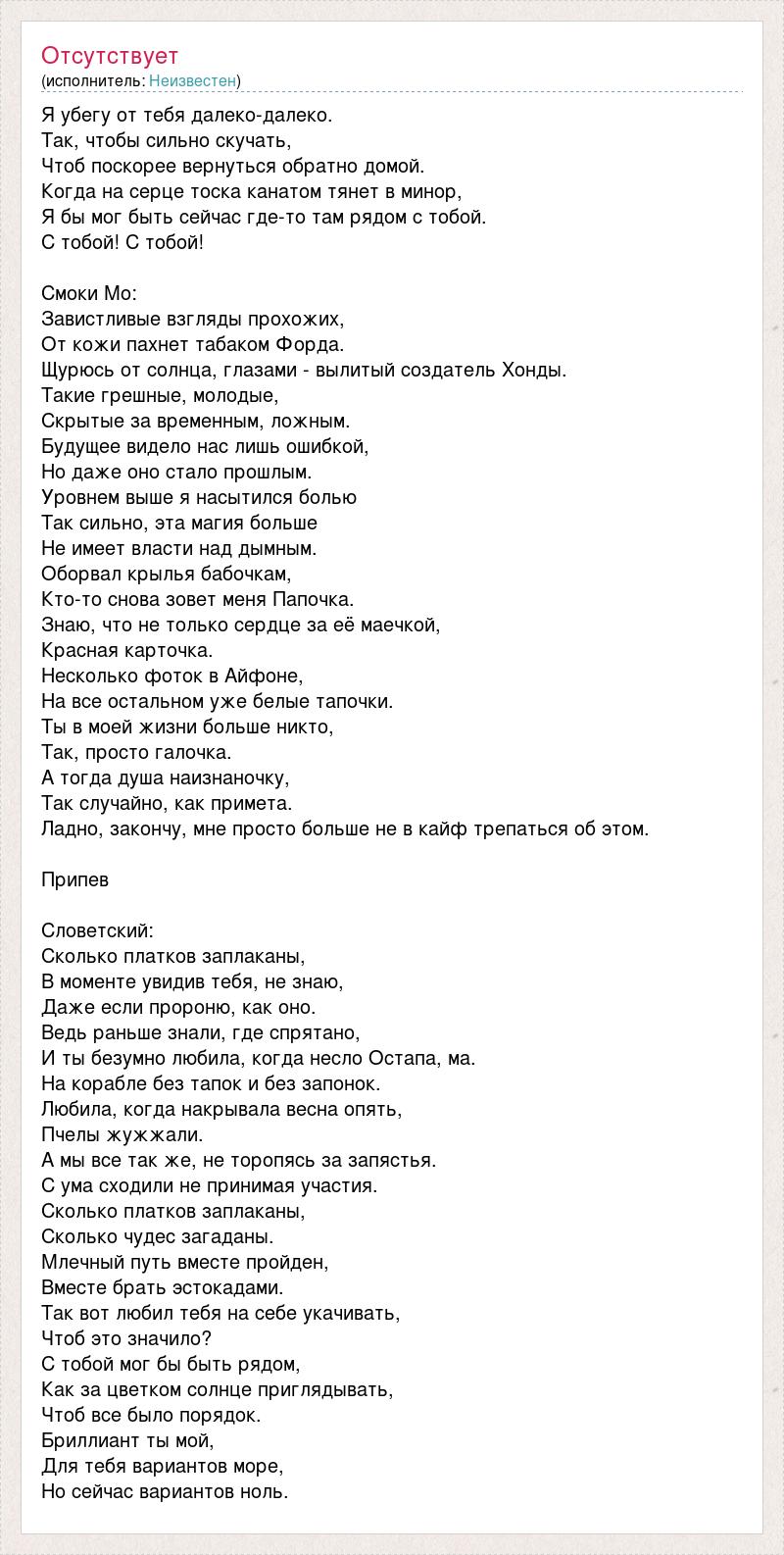 Я убегу от тебя далеко-далеко. Так, чтобы сильно скучать, Чтоб поскорее вернуться обратно домой. Когда на серце тоска канатом тянет в минор, Я бы мог быть сейчас где-то там рядом с тобой. С тобой! С тобой! Смоки Мо: Завистливые взгляды прохожих, От кожи пахнет табаком Форда. Щурюсь от солнца, глазами - вылитый создатель Хонды. Такие грешные, молодые, Скрытые за временным, ложным. Будущее видело нас лишь ошибкой, Но даже оно стало прошлым. Уровнем выше я насытился болью Так сильно, эта магия больше Не имеет власти над дымным. Оборвал крылья бабочкам, Кто-то снова зовет меня Папочка. Знаю, что не только сердце за её маечкой, Красная карточка. Несколько фоток в Айфоне, На все остальном уже белые тапочки. Ты в моей жизни больше никто, Так, просто галочка. А тогда душа наизнаночку, Так случайно, как примета. Ладно, закончу, мне просто больше не в кайф трепаться об этом. Припев Словетский: Сколько платков заплаканы, В моменте увидив тебя, не знаю, Даже если пророню, как оно. Ведь раньше знали, где спрятано, И ты безумно любила, когда несло Остапа, ма. На корабле без тапок и без запонок. Любила, когда накрывала весна опять, Пчелы жужжали. А мы все так же, не торопясь за запястья. С ума сходили не принимая участия. Сколько платков заплаканы, Сколько чудес загаданы. Млечный путь вместе пройден, Вместе брать эстокадами. Так вот любил тебя на себе укачивать, Чтоб это значило? С тобой мог бы быть рядом, Как за цветком солнце приглядывать, Чтоб все было порядок. Бриллиант ты мой, Для тебя вариантов море, Но сейчас вариантов ноль.