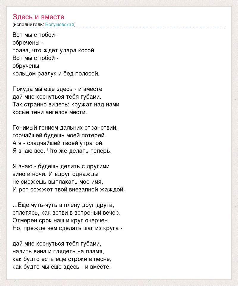 Вот мы с тобой - обречены - трава, что ждет удара косой. Вот мы с тобой - обручены кольцом разлук и бед полосой. Покуда мы еще здесь - и вместе дай мне коснуться тебя губами. Так странно видеть: кружат над нами косые тени ангелов мести. Гонимый гением дальних странствий, горчайшей будешь моей потерей. А я - сладчайшей твоей утратой. Я знаю все. Что же делать теперь. Я знаю - будешь делить с другими вино и ночи. И вдруг однажды не сможешь выплакать мое имя. И рот сожжет твой внезапной жаждой. ...Еще чуть-чуть в плену друг друга, сплетясь, как ветви в ветреный вечер. Отмерен срок наш и круг очерчен. Но, прежде чем сделать шаг из круга - дай мне коснуться тебя губами, налить вина и глядеть на пламя, как будто есть еще строки в песне, как будто мы еще здесь - и вместе.