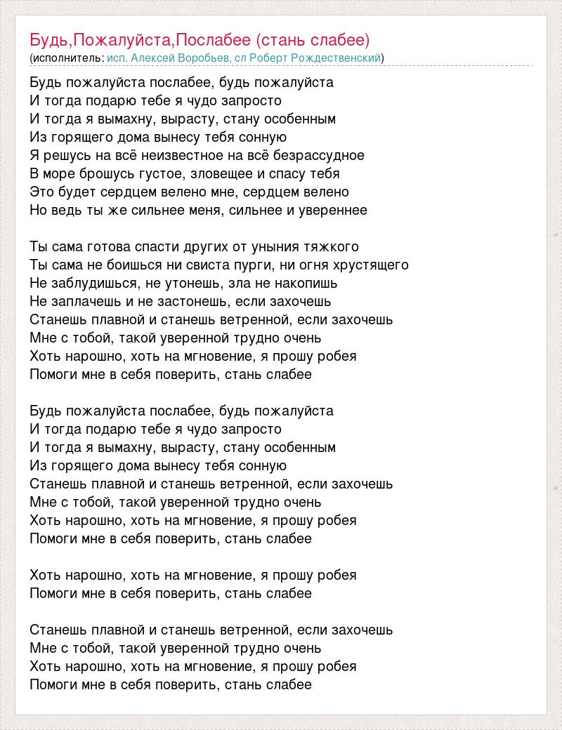 Будь пожалуйста послабее, будь пожалуйста И тогда подарю тебе я чудо запросто И тогда я вымахну, вырасту, стану особенным Из горящего дома вынесу тебя сонную Я решусь на всё неизвестное на всё безрассудное В море брошусь густое, зловещее и спасу тебя Это будет сердцем велено мне, сердцем велено Но ведь ты же сильнее меня, сильнее и увереннее Ты сама готова спасти других от уныния тяжкого Ты сама не боишься ни свиста пурги, ни огня хрустящего Не заблудишься, не утонешь, зла не накопишь Не заплачешь и не застонешь, если захочешь Станешь плавной и станешь ветренной, если захочешь Мне с тобой, такой уверенной трудно очень Хоть нарошно, хоть на мгновение, я прошу робея Помоги мне в себя поверить, стань слабее Будь пожалуйста послабее, будь пожалуйста И тогда подарю тебе я чудо запросто И тогда я вымахну, вырасту, стану особенным Из горящего дома вынесу тебя сонную Станешь плавной и станешь ветренной, если захочешь Мне с тобой, такой уверенной трудно очень Хоть нарошно, хоть на мгновение, я прошу робея Помоги мне в себя поверить, стань слабее Хоть нарошно, хоть на мгновение, я прошу робея Помоги мне в себя поверить, стань слабее Станешь плавной и станешь ветренной, если захочешь Мне с тобой, такой уверенной трудно очень Хоть нарошно, хоть на мгновение, я прошу робея Помоги мне в себя поверить, стань слабее
