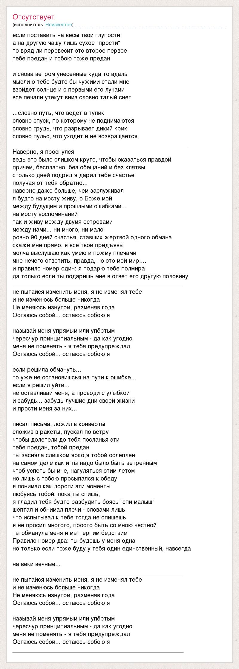 если поставить на весы твои глупости а на другую чашу лишь сухое "прости" то вряд ли перевесит это второе первое тебе предан и тобою тоже предан и снова ветром унесенные куда то вдаль мысли о тебе будто бы чужими стали мне взойдет солнце и с первыми его лучами все печали утекут вниз словно талый снег ...словно путь, что ведет в тупик словно спуск, по которому не поднимаются словно грудь, что разрывает дикий крик словно пульс, что уходит и не возвращается _____________________________________________________ Наверно, я проснулся ведь это было слишком круто, чтобы оказаться правдой причем, бесплатно, без обещаний и без клятвы столько дней подряд я дарил тебе счастье получая от тебя обратно... наверно даже больше, чем заслуживал я будто на мосту живу, о Боже мой между будущим и прошлыми ошибками... на мосту воспоминаний так и живу между двумя островами между нами... ни много, ни мало ровно 90 дней счастья, ставших жертвой одного обмана скажи мне прямо, я все твои предъявы молча выслушаю как умею и пожму плечами мне нечего ответить, правда, но это мой мир.... и правило номер один: я подарю тебе полмира да только если ты подаришь мне в ответ его другую половину ____________________________________________________ не пытайся изменить меня, я не изменял тебе и не изменюсь больше никогда Не меняюсь изнутри, разменяв года Остаюсь собой... остаюсь собою я называй меня упрямым или упёртым чересчур принципиальным - да как угодно меня не поменять - я тебя предупреждал Остаюсь собой... остаюсь собою я ____________________________________________________ если решила обмануть... то уже не остановишсья на пути к ошибке... если я решил уйти... не оставливай меня, а проводи с улыбкой и забудь... забудь лучшие дни своей жизни и прости меня за них... писал письма, ложил в конверты сложив в ракеты, пускал по ветру чтобы долетели до тебя посланья эти тебе предан, тобой предан ты засияла слишком ярко,я тобой ослеплен на самом деле как и ты надо было быть ветренным чтоб успеть бы мне, нагуляться этим летом но лишь с тобою просыпаяся к обеду я понимал как дороги эти моменты любуясь тобой, пока ты спишь, я гладил тебя будто разбудить боясь "спи малыш" шептал и обнимал плечи - словами лишь что испытывал к тебе тогда не опишешь я не просил многого, просто быть со мною честной ты обманула меня и мы терпим бедствие Правило номер два: ты будешь у меня одна но только если тоже буду у тебя один единственный, навсегда на веки вечные... ____________________________________________________ не пытайся изменить меня, я не изменял тебе и не изменюсь больше никогда Не меняюсь изнутри, разменяв года Остаюсь собой... остаюсь собою я называй меня упрямым или упёртым чересчур принципиальным - да как угодно меня не поменять - я тебя предупреждал Остаюсь собой... остаюсь собою я ____________________________________________________