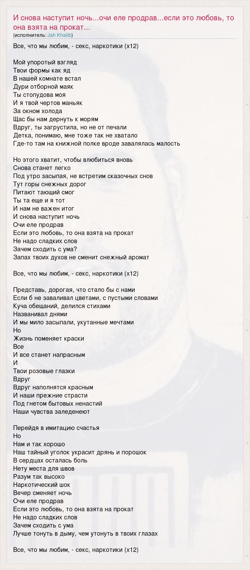 Все, что мы любим, - секс, наркотики (х12) Мой упоротый взгляд Твои формы как яд В нашей комнате встал Дури отборной маяк Ты стопудова моя И я твой чертов маньяк За окном холода Щас бы нам дернуть к морям Вдруг, ты загрустила, но не от печали Детка, понимаю, мне тоже так не хватало Где-то там на книжной полке вроде завалялась малость Но этого хватит, чтобы влюбиться вновь Снова станет легко Под утро засыпая, не встретим сказочных снов Тут горы снежных дорог Питают тающий смог Ты та еще и я тот И нам не важен итог И снова наступит ночь Очи еле продрав Если это любовь, то она взята на прокат Не надо сладких слов Зачем сходить с ума? Запах твоих духов не сменит снежный аромат Все, что мы любим, - секс, наркотики (х12) Представь, дорогая, что стало бы с нами Если б не заваливал цветами, с пустыми словами Куча обещаний, делился стихами Названивал днями И мы мило засыпали, укутанные мечтами Но Жизнь поменяет краски Все И все станет напрасным И Твои розовые глазки Вдруг Вдруг наполнятся красным И наши прежние страсти Под гнетом бытовых ненастий Наши чувства заледенеют Перейдя в имитацию счастья Но Нам и так хорошо Наш тайный уголок украсит дрянь и порошок В сердцах осталась боль Нету места для швов Разум так высоко Наркотический шок Вечер сменяет ночь Очи еле продрав Если это любовь, то она взята на прокат Не надо сладких слов Зачем сходить с ума Лучше тонуть в дыму, чем утонуть в твоих глазах Все, что мы любим, - секс, наркотики (х12)