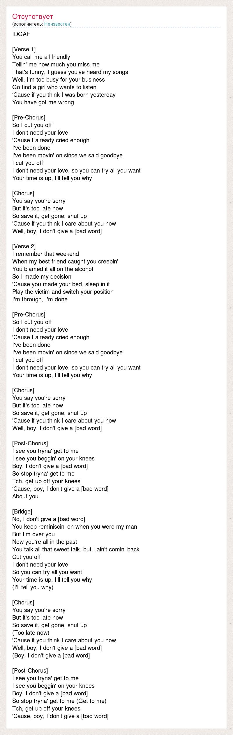 IDGAF [Verse 1] You call me all friendly Tellin' me how much you miss me That's funny, I guess you've heard my songs Well, I'm too busy for your business Go find a girl who wants to listen 'Cause if you think I was born yesterday You have got me wrong [Pre-Chorus] So I cut you off I don't need your love 'Cause I already cried enough I've been done I've been movin' on since we said goodbye I cut you off I don't need your love, so you can try all you want Your time is up, I'll tell you why [Chorus] You say you're sorry But it's too late now So save it, get gone, shut up 'Cause if you think I care about you now Well, boy, I don't give a [bad word] [Verse 2] I remember that weekend When my best friend caught you creepin' You blamed it all on the alcohol So I made my decision 'Cause you made your bed, sleep in it Play the victim and switch your position I'm through, I'm done [Pre-Chorus] So I cut you off I don't need your love 'Cause I already cried enough I've been done I've been movin' on since we said goodbye I cut you off I don't need your love, so you can try all you want Your time is up, I'll tell you why [Chorus] You say you're sorry But it's too late now So save it, get gone, shut up 'Cause if you think I care about you now Well, boy, I don't give a [bad word] [Post-Chorus] I see you tryna' get to me I see you beggin' on your knees Boy, I don't give a [bad word] So stop tryna' get to me Tch, get up off your knees 'Cause, boy, I don't give a [bad word] About you [Bridge] No, I don't give a [bad word] You keep reminiscin' on when you were my man But I'm over you Now you're all in the past You talk all that sweet talk, but I ain't comin' back Cut you off I don't need your love So you can try all you want Your time is up, I'll tell you why (I'll tell you why) [Chorus] You say you're sorry But it's too late now So save it, get gone, shut up (Too late now) 'Cause if you think I care about you now Well, boy, I don't give a [bad word] (Boy, I don't give a [bad word] [Post-Chorus] I see you tryna' get to me I see you beggin' on your knees Boy, I don't give a [bad word] So stop tryna' get to me (Get to me) Tch, get up off your knees 'Cause, boy, I don't give a [bad word]