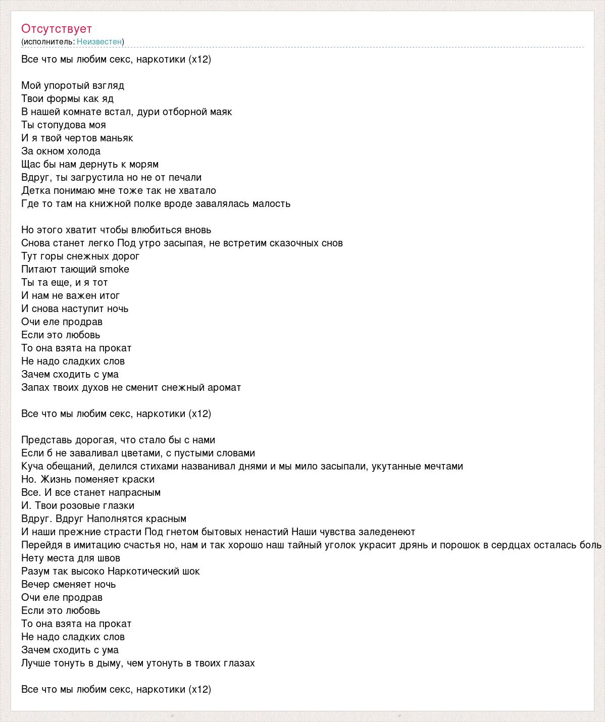 Все что мы любим секс, наркотики (х12) Мой упоротый взгляд Твои формы как яд В нашей комнате встал, дури отборной маяк Ты стопудова моя И я твой чертов маньяк За окном холода Щас бы нам дернуть к морям Вдруг, ты загрустила но не от печали Детка понимаю мне тоже так не хватало Где то там на книжной полке вроде завалялась малость Но этого хватит чтобы влюбиться вновь Снова станет легко Под утро засыпая, не встретим сказочных снов Тут горы снежных дорог Питают тающий smoke Ты та еще, и я тот И нам не важен итог И снова наступит ночь Очи еле продрав Если это любовь То она взята на прокат Не надо сладких слов Зачем сходить с ума Запах твоих духов не сменит снежный аромат Все что мы любим секс, наркотики (х12) Представь дорогая, что стало бы с нами Если б не заваливал цветами, с пустыми словами Куча обещаний, делился стихами названивал днями и мы мило засыпали, укутанные мечтами Но. Жизнь поменяет краски Все. И все станет напрасным И. Твои розовые глазки Вдруг. Вдруг Наполнятся красным И наши прежние страсти Под гнетом бытовых ненастий Наши чувства заледенеют Перейдя в имитацию счастья но, нам и так хорошо наш тайный уголок украсит дрянь и порошок в сердцах осталась боль Нету места для швов Разум так высоко Наркотический шок Вечер сменяет ночь Очи еле продрав Если это любовь То она взята на прокат Не надо сладких слов Зачем сходить с ума Лучше тонуть в дыму, чем утонуть в твоих глазах Все что мы любим секс, наркотики (х12)