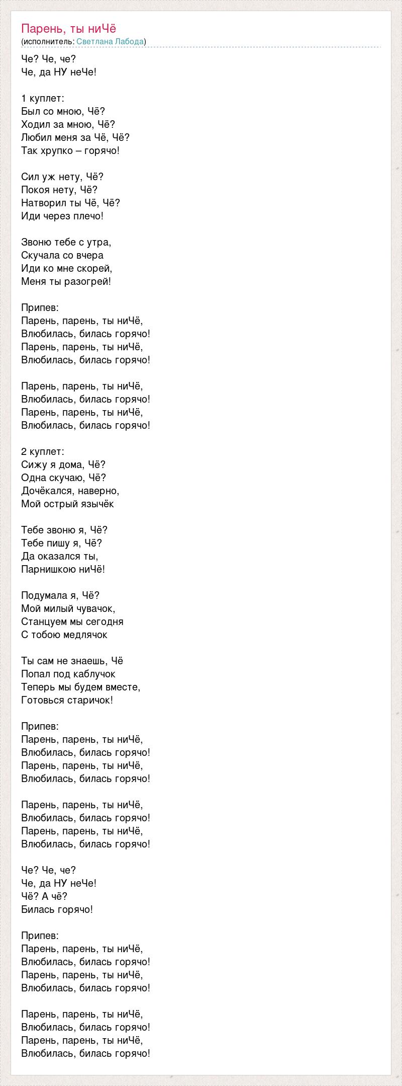 Че? Че, че? Че, да НУ неЧе! 1 куплет: Был со мною, Чё? Ходил за мною, Чё? Любил меня за Чё, Чё? Так хрупко – горячо! Сил уж нету, Чё? Покоя нету, Чё? Натворил ты Чё, Чё? Иди через плечо! Звоню тебе с утра, Скучала со вчера Иди ко мне скорей, Меня ты разогрей! Припев: Парень, парень, ты ниЧё, Влюбилась, билась горячо! Парень, парень, ты ниЧё, Влюбилась, билась горячо! Парень, парень, ты ниЧё, Влюбилась, билась горячо! Парень, парень, ты ниЧё, Влюбилась, билась горячо! 2 куплет: Сижу я дома, Чё? Одна скучаю, Чё? Дочёкался, наверно, Мой острый язычёк Тебе звоню я, Чё? Тебе пишу я, Чё? Да оказался ты, Парнишкою ниЧё! Подумала я, Чё? Мой милый чувачок, Станцуем мы сегодня С тобою медлячок Ты сам не знаешь, Чё Попал под каблучок Теперь мы будем вместе, Готовься старичок! Припев: Парень, парень, ты ниЧё, Влюбилась, билась горячо! Парень, парень, ты ниЧё, Влюбилась, билась горячо! Парень, парень, ты ниЧё, Влюбилась, билась горячо! Парень, парень, ты ниЧё, Влюбилась, билась горячо! Че? Че, че? Че, да НУ неЧе! Чё? А чё? Билась горячо! Припев: Парень, парень, ты ниЧё, Влюбилась, билась горячо! Парень, парень, ты ниЧё, Влюбилась, билась горячо! Парень, парень, ты ниЧё, Влюбилась, билась горячо! Парень, парень, ты ниЧё, Влюбилась, билась горячо!