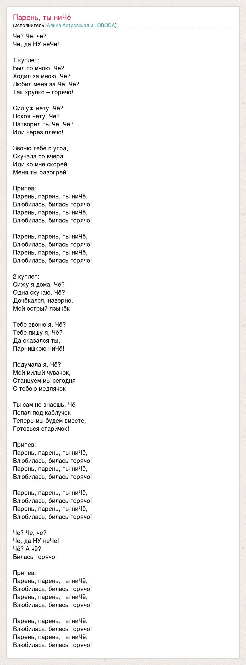 Че? Че, че? Че, да НУ неЧе! 1 куплет: Был со мною, Чё? Ходил за мною, Чё? Любил меня за Чё, Чё? Так хрупко – горячо! Сил уж нету, Чё? Покоя нету, Чё? Натворил ты Чё, Чё? Иди через плечо! Звоню тебе с утра, Скучала со вчера Иди ко мне скорей, Меня ты разогрей! Припев: Парень, парень, ты ниЧё, Влюбилась, билась горячо! Парень, парень, ты ниЧё, Влюбилась, билась горячо! Парень, парень, ты ниЧё, Влюбилась, билась горячо! Парень, парень, ты ниЧё, Влюбилась, билась горячо! 2 куплет: Сижу я дома, Чё? Одна скучаю, Чё? Дочёкался, наверно, Мой острый язычёк Тебе звоню я, Чё? Тебе пишу я, Чё? Да оказался ты, Парнишкою ниЧё! Подумала я, Чё? Мой милый чувачок, Станцуем мы сегодня С тобою медлячок Ты сам не знаешь, Чё Попал под каблучок Теперь мы будем вместе, Готовься старичок! Припев: Парень, парень, ты ниЧё, Влюбилась, билась горячо! Парень, парень, ты ниЧё, Влюбилась, билась горячо! Парень, парень, ты ниЧё, Влюбилась, билась горячо! Парень, парень, ты ниЧё, Влюбилась, билась горячо! Че? Че, че? Че, да НУ неЧе! Чё? А чё? Билась горячо! Припев: Парень, парень, ты ниЧё, Влюбилась, билась горячо! Парень, парень, ты ниЧё, Влюбилась, билась горячо! Парень, парень, ты ниЧё, Влюбилась, билась горячо! Парень, парень, ты ниЧё, Влюбилась, билась горячо!