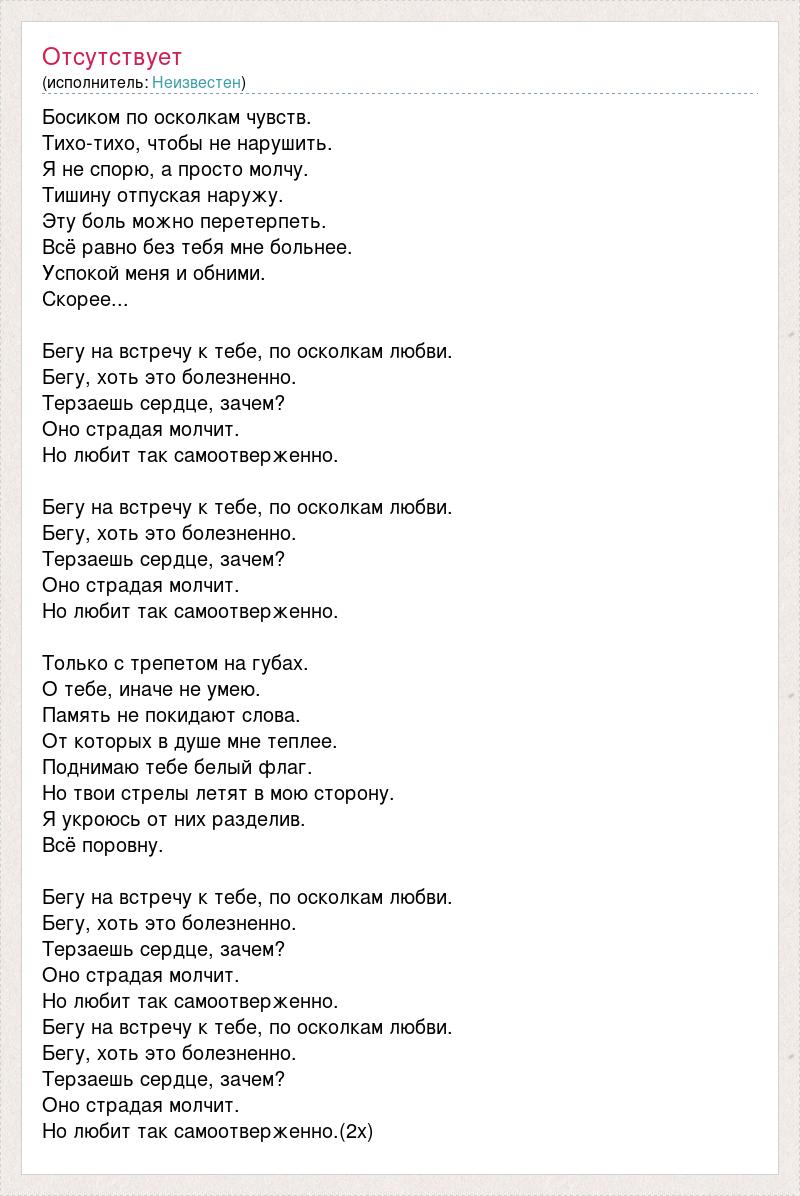 Босиком по осколкам чувств. Тихо-тихо, чтобы не нарушить. Я не спорю, а просто молчу. Тишину отпуская наружу. Эту боль можно перетерпеть. Всё равно без тебя мне больнее. Успокой меня и обними. Скорее... Бегу на встречу к тебе, по осколкам любви. Бегу, хоть это болезненно. Терзаешь сердце, зачем? Оно страдая молчит. Но любит так самоотверженно. Бегу на встречу к тебе, по осколкам любви. Бегу, хоть это болезненно. Терзаешь сердце, зачем? Оно страдая молчит. Но любит так самоотверженно. Только с трепетом на губах. О тебе, иначе не умею. Память не покидают слова. От которых в душе мне теплее. Поднимаю тебе белый флаг. Но твои стрелы летят в мою сторону. Я укроюсь от них разделив. Всё поровну. Бегу на встречу к тебе, по осколкам любви. Бегу, хоть это болезненно. Терзаешь сердце, зачем? Оно страдая молчит. Но любит так самоотверженно. Бегу на встречу к тебе, по осколкам любви. Бегу, хоть это болезненно. Терзаешь сердце, зачем? Оно страдая молчит. Но любит так самоотверженно.(2х)