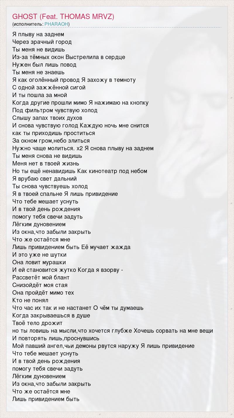 Я плыву на заднем Через зрачный город Ты меня не видишь Из-за тёмных окон Выстрелила в сердце Нужен был лишь повод Ты меня не знаешь Я как оголённый провод Я захожу в темноту С одной зажжённой сигой И ты пошла за мной Когда другие прошли мимо Я нажимаю на кнопку Под фильтром чувствую холод Слышу запах твоих духов И снова чувствую голод Каждую ночь мне снится как ты приходишь проститься За окном гром,небо злиться Нужно чаще молиться. x2 Я снова плыву на заднем Ты меня снова не видишь Меня нет в твоей жизнь Но ты ещё ненавидишь Как кинотеатр под небом Я врубаю свет дальний Ты снова чувствуешь холод Я в твоей спальне Я лишь привидение Что тебе мешает уснуть И в твой день рождения помогу тебя свечи задуть Лёгким дуновением Из окна,что забыли закрыть Что же остаётся мне Лишь привидением быть Её мучает жажда И это уже не шутки Она ловит мурашки И ей становится жутко Когда я взорву - Рассветёт мой блант Снизойдёт моя стая Она пройдёт мимо тех Кто не понял Что час их так и не настанет О чём ты думаешь Когда закрываешься в душе Твоё тело дрожит но ты ловишь на мысли,что хочется глубже Хочешь сорвать на мне вещи И повторять лишь,проснувшись Мой павший ангел,чьи демоны рвутся наружу Я лишь привидение Что тебе мешает уснуть И в твой день рождения помогу тебя свечи задуть Лёгким дуновением Из окна,что забыли закрыть Что же остаётся мне Лишь привидением быть