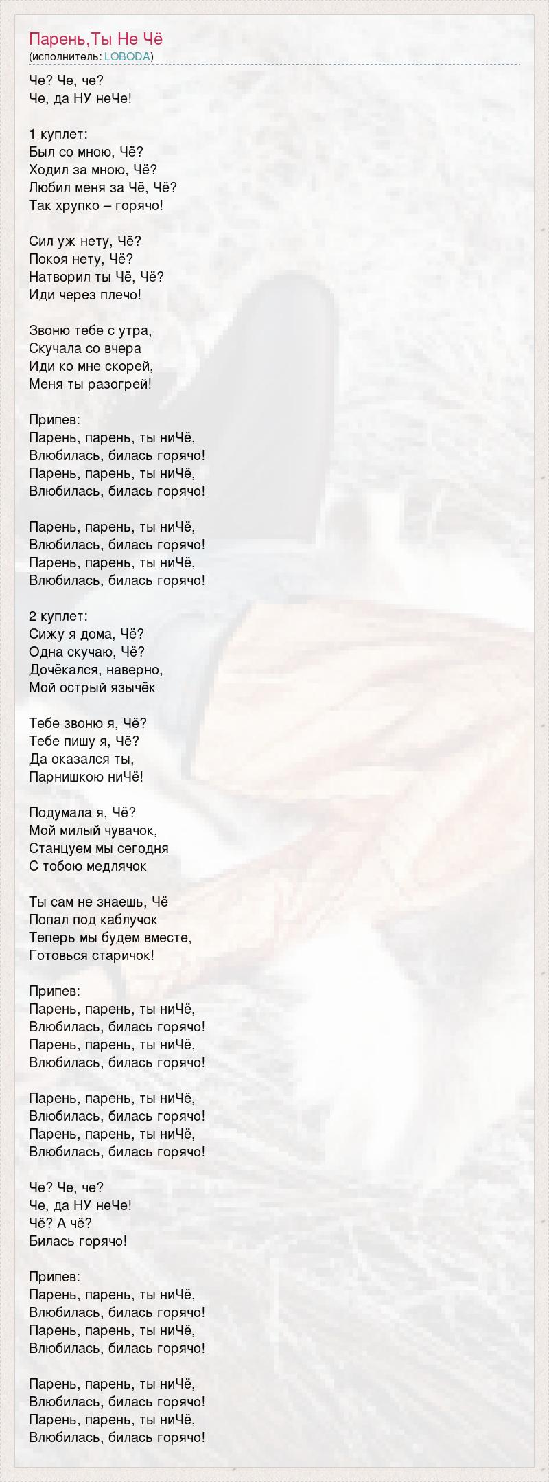Че? Че, че? Че, да НУ неЧе! 1 куплет: Был со мною, Чё? Ходил за мною, Чё? Любил меня за Чё, Чё? Так хрупко – горячо! Сил уж нету, Чё? Покоя нету, Чё? Натворил ты Чё, Чё? Иди через плечо! Звоню тебе с утра, Скучала со вчера Иди ко мне скорей, Меня ты разогрей! Припев: Парень, парень, ты ниЧё, Влюбилась, билась горячо! Парень, парень, ты ниЧё, Влюбилась, билась горячо! Парень, парень, ты ниЧё, Влюбилась, билась горячо! Парень, парень, ты ниЧё, Влюбилась, билась горячо! 2 куплет: Сижу я дома, Чё? Одна скучаю, Чё? Дочёкался, наверно, Мой острый язычёк Тебе звоню я, Чё? Тебе пишу я, Чё? Да оказался ты, Парнишкою ниЧё! Подумала я, Чё? Мой милый чувачок, Станцуем мы сегодня С тобою медлячок Ты сам не знаешь, Чё Попал под каблучок Теперь мы будем вместе, Готовься старичок! Припев: Парень, парень, ты ниЧё, Влюбилась, билась горячо! Парень, парень, ты ниЧё, Влюбилась, билась горячо! Парень, парень, ты ниЧё, Влюбилась, билась горячо! Парень, парень, ты ниЧё, Влюбилась, билась горячо! Че? Че, че? Че, да НУ неЧе! Чё? А чё? Билась горячо! Припев: Парень, парень, ты ниЧё, Влюбилась, билась горячо! Парень, парень, ты ниЧё, Влюбилась, билась горячо! Парень, парень, ты ниЧё, Влюбилась, билась горячо! Парень, парень, ты ниЧё, Влюбилась, билась горячо!
