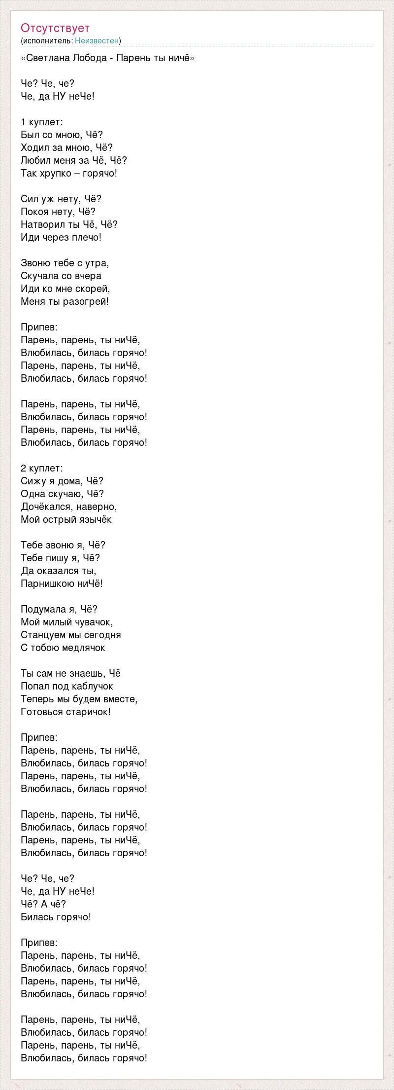 «Светлана Лобода - Парень ты ничё» Че? Че, че? Че, да НУ неЧе! 1 куплет: Был со мною, Чё? Ходил за мною, Чё? Любил меня за Чё, Чё? Так хрупко – горячо! Сил уж нету, Чё? Покоя нету, Чё? Натворил ты Чё, Чё? Иди через плечо! Звоню тебе с утра, Скучала со вчера Иди ко мне скорей, Меня ты разогрей! Припев: Парень, парень, ты ниЧё, Влюбилась, билась горячо! Парень, парень, ты ниЧё, Влюбилась, билась горячо! Парень, парень, ты ниЧё, Влюбилась, билась горячо! Парень, парень, ты ниЧё, Влюбилась, билась горячо! 2 куплет: Сижу я дома, Чё? Одна скучаю, Чё? Дочёкался, наверно, Мой острый язычёк Тебе звоню я, Чё? Тебе пишу я, Чё? Да оказался ты, Парнишкою ниЧё! Подумала я, Чё? Мой милый чувачок, Станцуем мы сегодня С тобою медлячок Ты сам не знаешь, Чё Попал под каблучок Теперь мы будем вместе, Готовься старичок! Припев: Парень, парень, ты ниЧё, Влюбилась, билась горячо! Парень, парень, ты ниЧё, Влюбилась, билась горячо! Парень, парень, ты ниЧё, Влюбилась, билась горячо! Парень, парень, ты ниЧё, Влюбилась, билась горячо! Че? Че, че? Че, да НУ неЧе! Чё? А чё? Билась горячо! Припев: Парень, парень, ты ниЧё, Влюбилась, билась горячо! Парень, парень, ты ниЧё, Влюбилась, билась горячо! Парень, парень, ты ниЧё, Влюбилась, билась горячо! Парень, парень, ты ниЧё, Влюбилась, билась горячо!