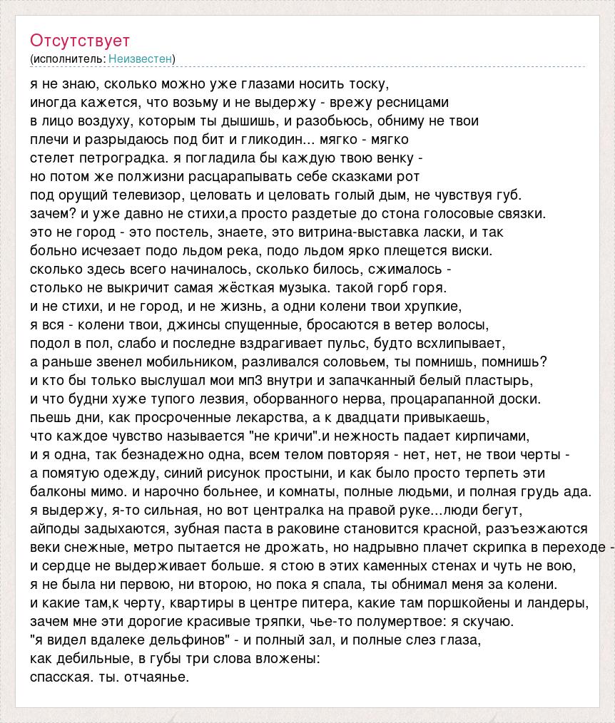 А как ты думаешь, о чем песня "я не знаю, сколько можно уже глазами носить тоску" ?