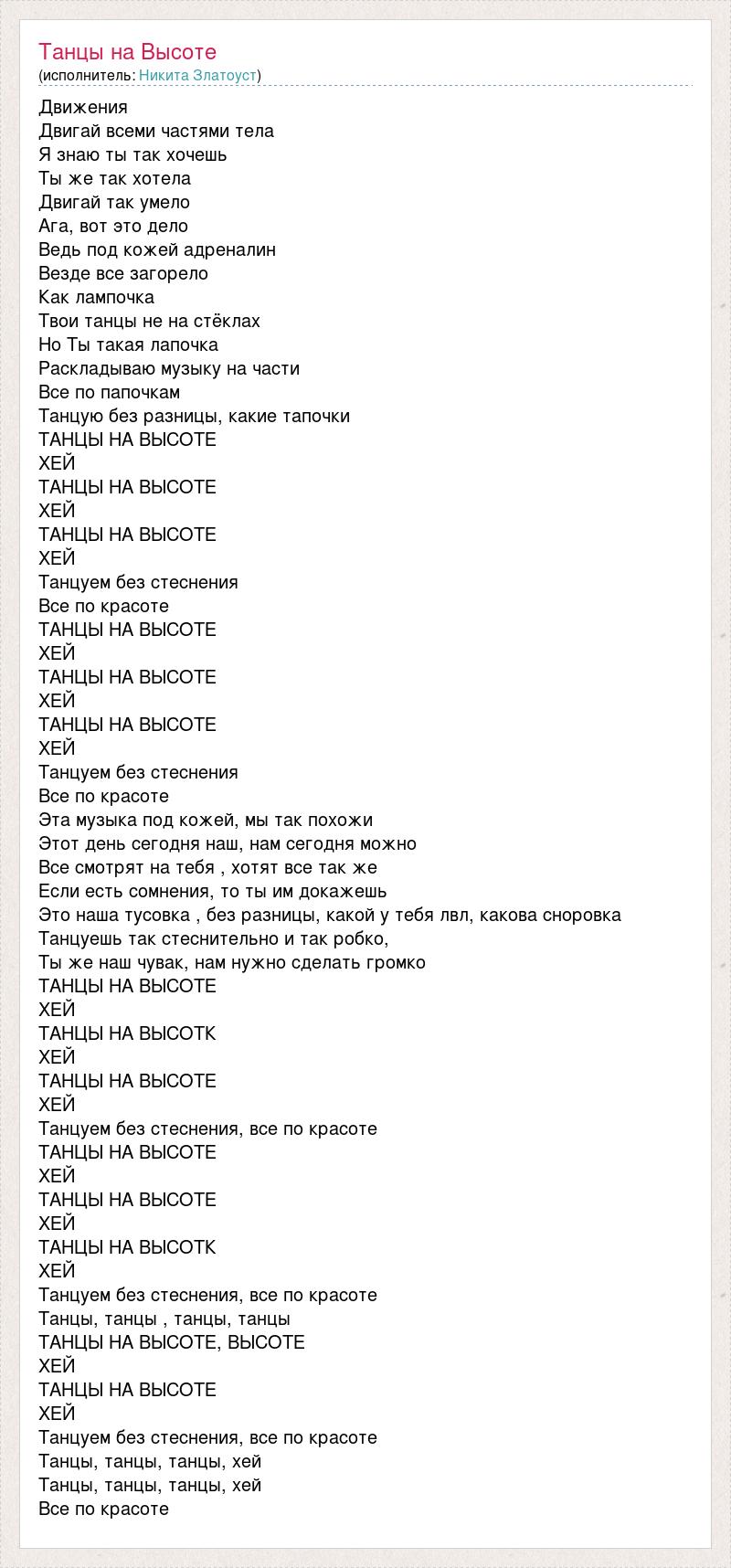 Движения Двигай всеми частями тела Я знаю ты так хочешь Ты же так хотела Двигай так умело Ага, вот это дело Ведь под кожей адреналин Везде все загорело Как лампочка Твои танцы не на стёклах Но Ты такая лапочка Раскладываю музыку на части Все по папочкам Танцую без разницы, какие тапочки ТАНЦЫ НА ВЫСОТЕ ХЕЙ ТАНЦЫ НА ВЫСОТЕ ХЕЙ ТАНЦЫ НА ВЫСОТЕ ХЕЙ Танцуем без стеснения Все по красоте ТАНЦЫ НА ВЫСОТЕ ХЕЙ ТАНЦЫ НА ВЫСОТЕ ХЕЙ ТАНЦЫ НА ВЫСОТЕ ХЕЙ Танцуем без стеснения Все по красоте Эта музыка под кожей, мы так похожи Этот день сегодня наш, нам сегодня можно Все смотрят на тебя , хотят все так же Если есть сомнения, то ты им докажешь Это наша тусовка , без разницы, какой у тебя лвл, какова сноровка Танцуешь так стеснительно и так робко, Ты же наш чувак, нам нужно сделать громко ТАНЦЫ НА ВЫСОТЕ ХЕЙ ТАНЦЫ НА ВЫСОТК ХЕЙ ТАНЦЫ НА ВЫСОТЕ ХЕЙ Танцуем без стеснения, все по красоте ТАНЦЫ НА ВЫСОТЕ ХЕЙ ТАНЦЫ НА ВЫСОТЕ ХЕЙ ТАНЦЫ НА ВЫСОТК ХЕЙ Танцуем без стеснения, все по красоте Танцы, танцы , танцы, танцы ТАНЦЫ НА ВЫСОТЕ, ВЫСОТЕ ХЕЙ ТАНЦЫ НА ВЫСОТЕ ХЕЙ Танцуем без стеснения, все по красоте Танцы, танцы, танцы, хей Танцы, танцы, танцы, хей Все по красоте