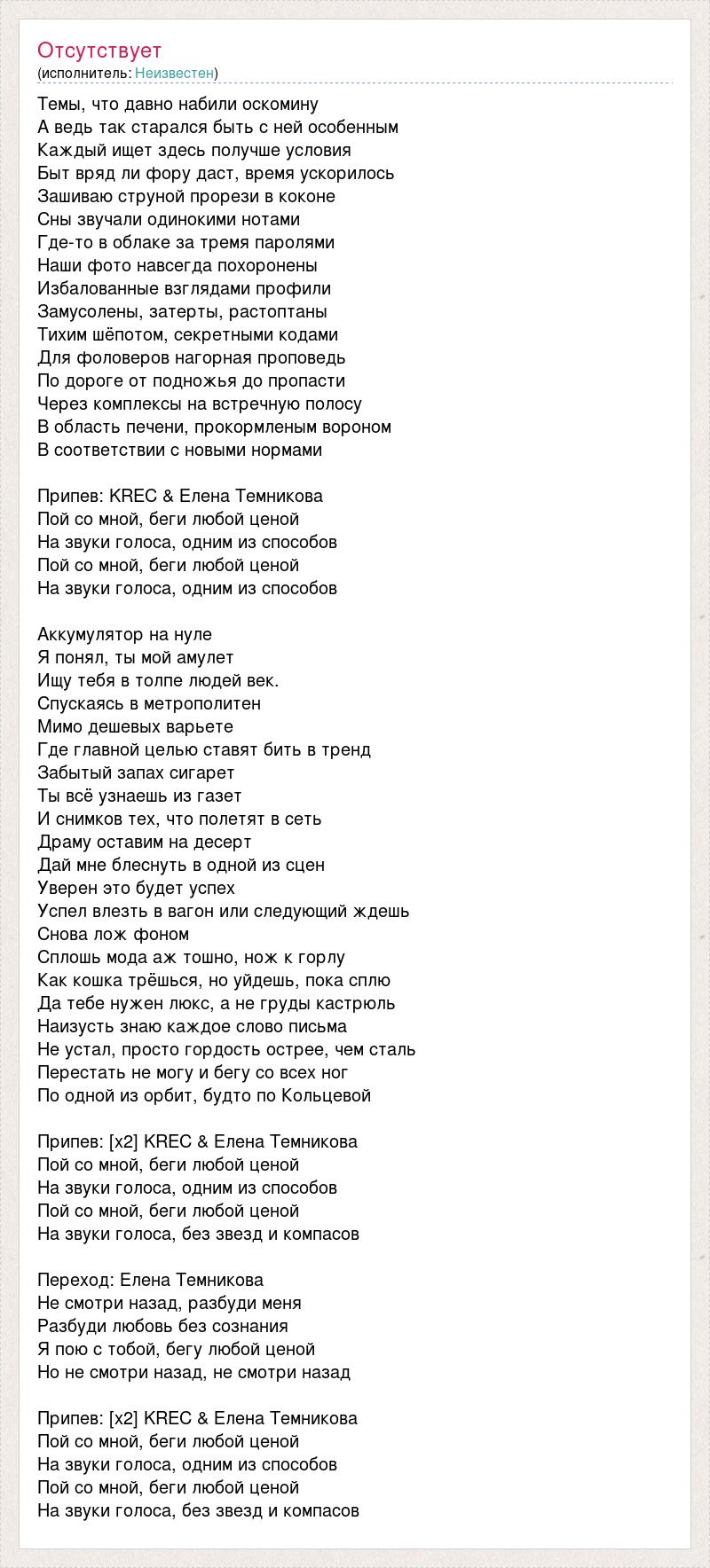 Темы, что давно набили оскомину А ведь так старался быть с ней особенным Каждый ищет здесь получше условия Быт вряд ли фору даст, время ускорилось Зашиваю струной прорези в коконе Сны звучали одинокими нотами Где-то в облаке за тремя паролями Наши фото навсегда похоронены Избалованные взглядами профили Замусолены, затерты, растоптаны Тихим шёпотом, секретными кодами Для фоловеров нагорная проповедь По дороге от подножья до пропасти Через комплексы на встречную полосу В область печени, прокормленым вороном В соответствии с новыми нормами Припев: KREC & Елена Темникова Пой со мной, беги любой ценой На звуки голоса, одним из способов Пой со мной, беги любой ценой На звуки голоса, одним из способов Аккумулятор на нуле Я понял, ты мой амулет Ищу тебя в толпе людей век. Спускаясь в метрополитен Мимо дешевых варьете Где главной целью ставят бить в тренд Забытый запах сигарет Ты всё узнаешь из газет И снимков тех, что полетят в сеть Драму оставим на десерт Дай мне блеснуть в одной из сцен Уверен это будет успех Успел влезть в вагон или следующий ждешь Снова лож фоном Сплошь мода аж тошно, нож к горлу Как кошка трёшься, но уйдешь, пока сплю Да тебе нужен люкс, а не груды кастрюль Наизусть знаю каждое слово письма Не устал, просто гордость острее, чем сталь Перестать не могу и бегу со всех ног По одной из орбит, будто по Кольцевой Припев: [x2] KREC & Елена Темникова Пой со мной, беги любой ценой На звуки голоса, одним из способов Пой со мной, беги любой ценой На звуки голоса, без звезд и компасов Переход: Елена Темникова Не смотри назад, разбуди меня Разбуди любовь без сознания Я пою с тобой, бегу любой ценой Но не смотри назад, не смотри назад Припев: [x2] KREC & Елена Темникова Пой со мной, беги любой ценой На звуки голоса, одним из способов Пой со мной, беги любой ценой На звуки голоса, без звезд и компасов