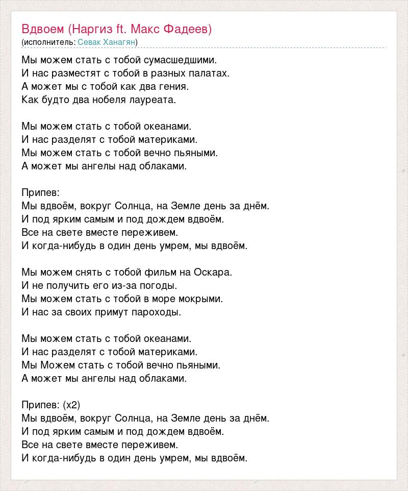 Мы можем стать с тобой сумасшедшими. И нас разместят с тобой в разных палатах. А может мы с тобой как два гения. Как будто два нобеля лауреата. Мы можем стать с тобой океанами. И нас разделят с тобой материками. Мы можем стать с тобой вечно пьяными. А может мы ангелы над облаками. Припев: Мы вдвоём, вокруг Солнца, на Земле день за днём. И под ярким самым и под дождем вдвоём. Все на свете вместе переживем. И когда-нибудь в один день умрем, мы вдвоём. Мы можем снять с тобой фильм на Оскара. И не получить его из-за погоды. Мы можем стать с тобой в море мокрыми. И нас за своих примут пароходы. Мы можем стать с тобой океанами. И нас разделят с тобой материками. Мы Можем стать с тобой вечно пьяными. А может мы ангелы над облаками. Припев: (х2) Мы вдвоём, вокруг Солнца, на Земле день за днём. И под ярким самым и под дождем вдвоём. Все на свете вместе переживем. И когда-нибудь в один день умрем, мы вдвоём.