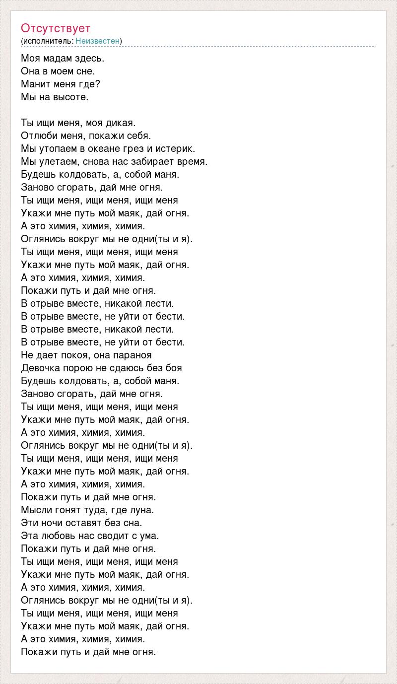 Моя мадам здесь. Она в моем сне. Манит меня где? Мы на высоте. Ты ищи меня, моя дикая. Отлюби меня, покажи себя. Мы утопаем в океане грез и истерик. Мы улетаем, снова нас забирает время. Будешь колдовать, а, собой маня. Заново сгорать, дай мне огня. Ты ищи меня, ищи меня, ищи меня Укажи мне путь мой маяк, дай огня. А это химия, химия, химия. Оглянись вокруг мы не одни(ты и я). Ты ищи меня, ищи меня, ищи меня Укажи мне путь мой маяк, дай огня. А это химия, химия, химия. Покажи путь и дай мне огня. В отрыве вместе, никакой лести. В отрыве вместе, не уйти от бести. В отрыве вместе, никакой лести. В отрыве вместе, не уйти от бести. Не дает покоя, она параноя Девочка порою не сдаюсь без боя Будешь колдовать, а, собой маня. Заново сгорать, дай мне огня. Ты ищи меня, ищи меня, ищи меня Укажи мне путь мой маяк, дай огня. А это химия, химия, химия. Оглянись вокруг мы не одни(ты и я). Ты ищи меня, ищи меня, ищи меня Укажи мне путь мой маяк, дай огня. А это химия, химия, химия. Покажи путь и дай мне огня. Мысли гонят туда, где луна. Эти ночи оставят без сна. Эта любовь нас сводит с ума. Покажи путь и дай мне огня. Ты ищи меня, ищи меня, ищи меня Укажи мне путь мой маяк, дай огня. А это химия, химия, химия. Оглянись вокруг мы не одни(ты и я). Ты ищи меня, ищи меня, ищи меня Укажи мне путь мой маяк, дай огня. А это химия, химия, химия. Покажи путь и дай мне огня.