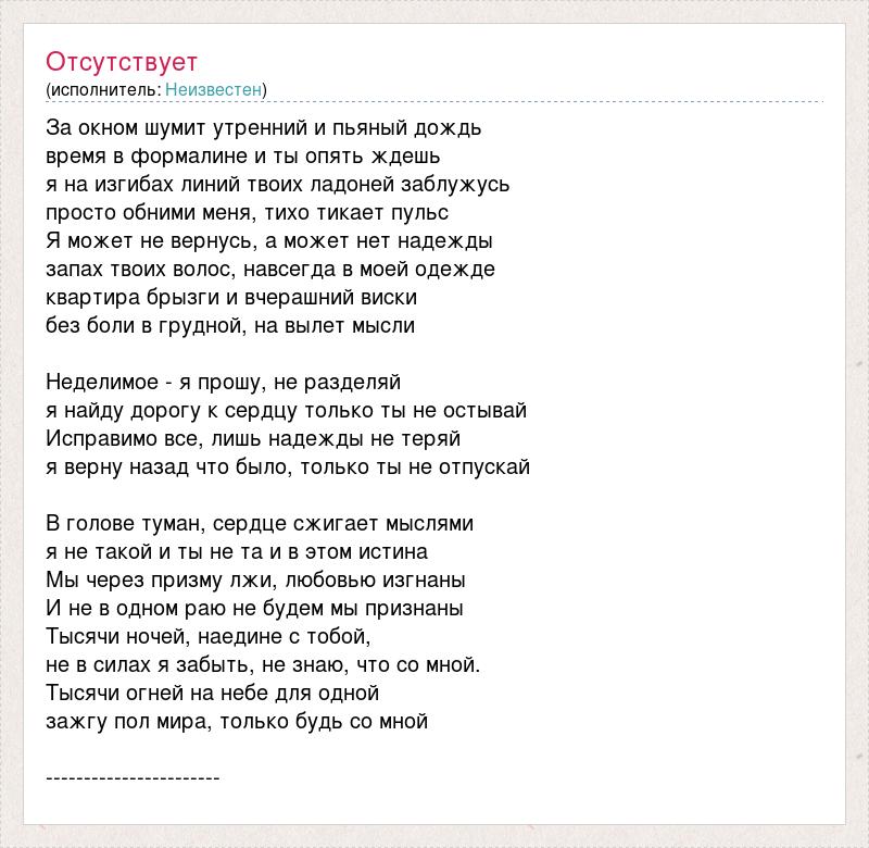 За окном шумит утренний и пьяный дождь время в формалине и ты опять ждешь я на изгибах линий твоих ладоней заблужусь просто обними меня, тихо тикает пульс Я может не вернусь, а может нет надежды запах твоих волос, навсегда в моей одежде квартира брызги и вчерашний виски без боли в грудной, на вылет мысли Неделимое - я прошу, не разделяй я найду дорогу к сердцу только ты не остывай Исправимо все, лишь надежды не теряй я верну назад что было, только ты не отпускай В голове туман, сердце сжигает мыслями я не такой и ты не та и в этом истина Мы через призму лжи, любовью изгнаны И не в одном раю не будем мы признаны Тысячи ночей, наедине с тобой, не в силах я забыть, не знаю, что со мной. Тысячи огней на небе для одной зажгу пол мира, только будь со мной -----------------------