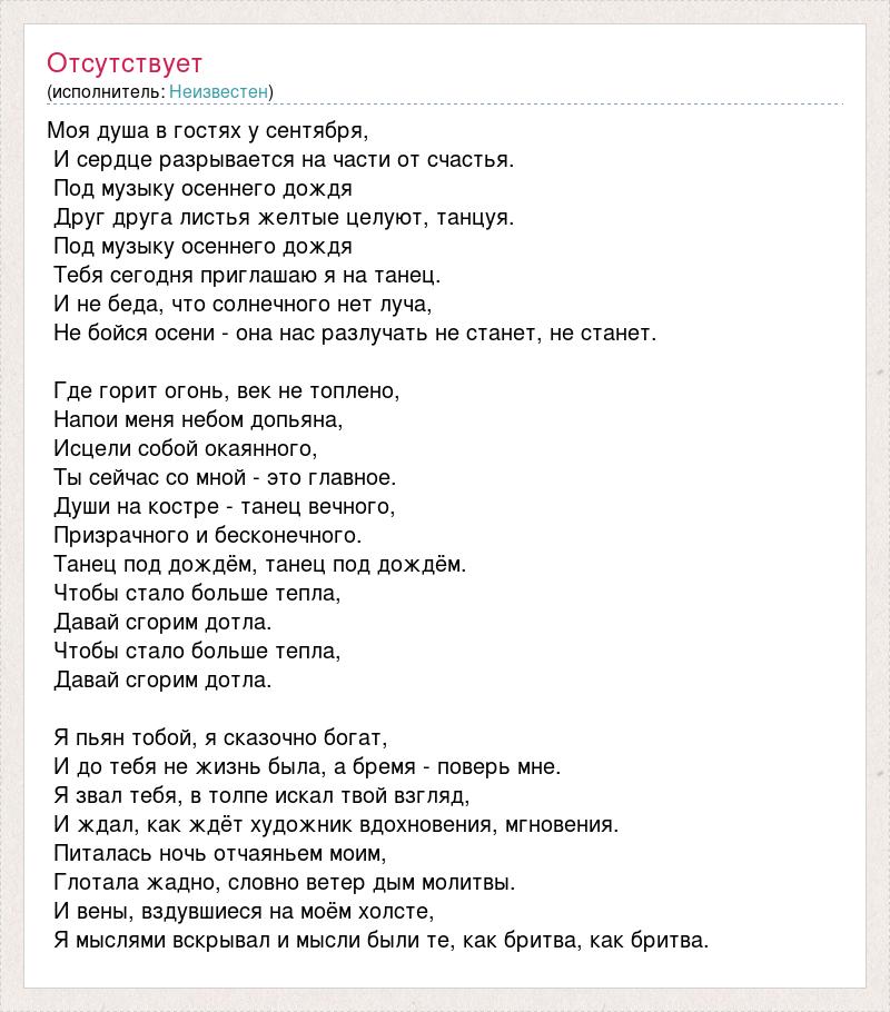 Моя душа в гостях у сентября, И сердце разрывается на части от счастья. Под музыку осеннего дождя Друг друга листья желтые целуют, танцуя. Под музыку осеннего дождя Тебя сегодня приглашаю я на танец. И не беда, что солнечного нет луча, Не бойся осени - она нас разлучать не станет, не станет. Где горит огонь, век не топлено, Напои меня небом допьяна, Исцели собой окаянного, Ты сейчас со мной - это главное. Души на костре - танец вечного, Призрачного и бесконечного. Танец под дождём, танец под дождём. Чтобы стало больше тепла, Давай сгорим дотла. Чтобы стало больше тепла, Давай сгорим дотла. Я пьян тобой, я сказочно богат, И до тебя не жизнь была, а бремя - поверь мне. Я звал тебя, в толпе искал твой взгляд, И ждал, как ждёт художник вдохновения, мгновения. Питалась ночь отчаяньем моим, Глотала жадно, словно ветер дым молитвы. И вены, вздувшиеся на моём холсте, Я мыслями вскрывал и мысли были те, как бритва, как бритва.