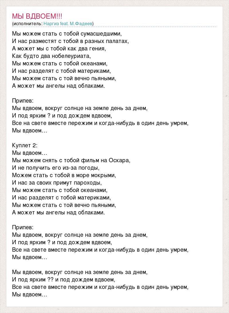 Мы можем стать с тобой сумасшедшими, И нас разместят с тобой в разных палатах, А может мы с тобой как два гения, Как будто два нобелеуриата, Мы можем стать с тобой океанами, И нас разделят с тобой материками, Мы можем стать с той вечно пьяными, А может мы ангелы над облаками. Припев: Мы вдвоем, вокруг солнце на земле день за днем, И под ярким ? и под дождем вдвоем, Все на свете вместе пережим и когда-нибудь в один день умрем, Мы вдвоем… Куплет 2: Мы вдвоем… Мы можем снять с тобой фильм на Оскара, И не получить его из-за погоды, Можем стать с тобой в море мокрыми, И нас за своих примут пароходы, Мы можем стать с тобой океанами, И нас разделят с тобой материками, Мы можем стать с той вечно пьяными, А может мы ангелы над облаками. Припев: Мы вдвоем, вокруг солнце на земле день за днем, И под ярким ? и под дождем вдвоем, Все на свете вместе пережим и когда-нибудь в один день умрем, Мы вдвоем… Мы вдвоем, вокруг солнце на земле день за днем, И под ярким ?? и под дождем вдвоем, Все на свете вместе пережим и когда-нибудь в один день умрем, Мы вдвоем…