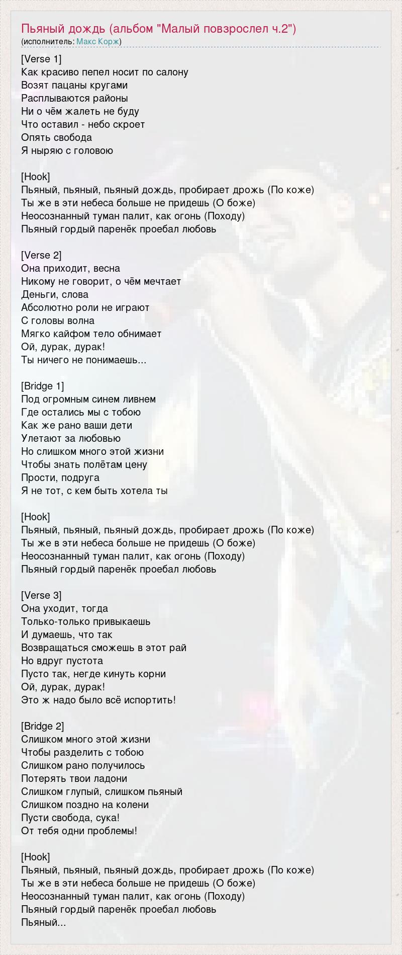[Verse 1] Как красиво пепел носит по салону Возят пацаны кругами Расплываются районы Ни о чём жалеть не буду Что оставил - небо скроет Опять свобода Я ныряю с головою [Hook] Пьяный, пьяный, пьяный дождь, пробирает дрожь (По коже) Ты же в эти небеса больше не придешь (О боже) Неосознанный туман палит, как огонь (Походу) Пьяный гордый паренёк проебал любовь [Verse 2] Она приходит, весна Никому не говорит, о чём мечтает Деньги, слова Абсолютно роли не играют С головы волна Мягко кайфом тело обнимает Ой, дурак, дурак! Ты ничего не понимаешь... [Bridge 1] Под огромным синем ливнем Где остались мы с тобою Как же рано ваши дети Улетают за любовью Но слишком много этой жизни Чтобы знать полётам цену Прости, подруга Я не тот, с кем быть хотела ты [Hook] Пьяный, пьяный, пьяный дождь, пробирает дрожь (По коже) Ты же в эти небеса больше не придешь (О боже) Неосознанный туман палит, как огонь (Походу) Пьяный гордый паренёк проебал любовь [Verse 3] Она уходит, тогда Только-только привыкаешь И думаешь, что так Возвращаться сможешь в этот рай Но вдруг пустота Пусто так, негде кинуть корни Ой, дурак, дурак! Это ж надо было всё испортить! [Bridge 2] Слишком много этой жизни Чтобы разделить с тобою Слишком рано получилось Потерять твои ладони Слишком глупый, слишком пьяный Слишком поздно на колени Пусти свобода, сука! От тебя одни проблемы! [Hook] Пьяный, пьяный, пьяный дождь, пробирает дрожь (По коже) Ты же в эти небеса больше не придешь (О боже) Неосознанный туман палит, как огонь (Походу) Пьяный гордый паренёк проебал любовь Пьяный...
