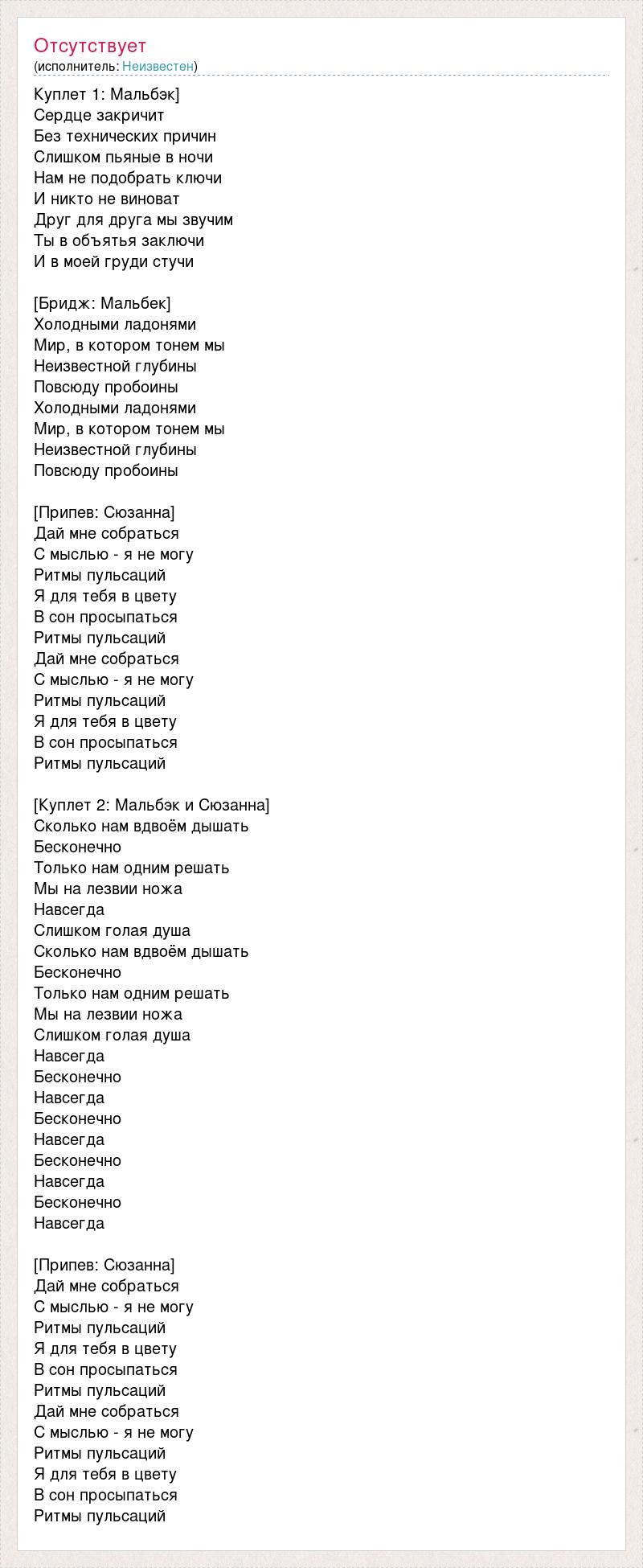 Куплет 1: Мальбэк] Сердце закричит Без технических причин Слишком пьяные в ночи Нам не подобрать ключи И никто не виноват Друг для друга мы звучим Ты в объятья заключи И в моей груди стучи [Бридж: Мальбек] Холодными ладонями Мир, в котором тонем мы Неизвестной глубины Повсюду пробоины Холодными ладонями Мир, в котором тонем мы Неизвестной глубины Повсюду пробоины [Припев: Сюзанна] Дай мне собраться С мыслью - я не могу Ритмы пульсаций Я для тебя в цвету В сон просыпаться Ритмы пульсаций Дай мне собраться С мыслью - я не могу Ритмы пульсаций Я для тебя в цвету В сон просыпаться Ритмы пульсаций [Куплет 2: Мальбэк и Сюзанна] Сколько нам вдвоём дышать Бесконечно Только нам одним решать Мы на лезвии ножа Навсегда Слишком голая душа Сколько нам вдвоём дышать Бесконечно Только нам одним решать Мы на лезвии ножа Слишком голая душа Навсегда Бесконечно Навсегда Бесконечно Навсегда Бесконечно Навсегда Бесконечно Навсегда [Припев: Сюзанна] Дай мне собраться С мыслью - я не могу Ритмы пульсаций Я для тебя в цвету В сон просыпаться Ритмы пульсаций Дай мне собраться С мыслью - я не могу Ритмы пульсаций Я для тебя в цвету В сон просыпаться Ритмы пульсаций