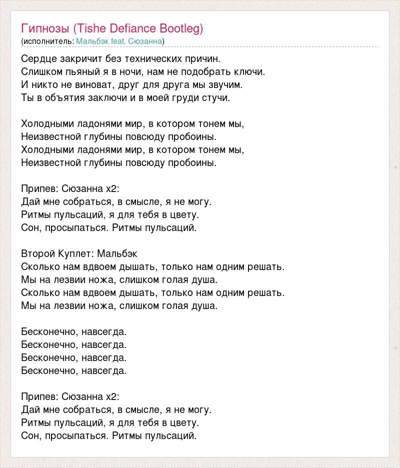 Сердце закричит без технических причин. Слишком пьяный я в ночи, нам не подобрать ключи. И никто не виноват, друг для друга мы звучим. Ты в объятия заключи и в моей груди стучи. Холодными ладонями мир, в котором тонем мы, Неизвестной глубины повсюду пробоины. Холодными ладонями мир, в котором тонем мы, Неизвестной глубины повсюду пробоины. Припев: Сюзанна х2: Дай мне собраться, в смысле, я не могу. Ритмы пульсаций, я для тебя в цвету. Сон, просыпаться. Ритмы пульсаций. Второй Куплет: Мальбэк Сколько нам вдвоем дышать, только нам одним решать. Мы на лезвии ножа, слишком голая душа. Сколько нам вдвоем дышать, только нам одним решать. Мы на лезвии ножа, слишком голая душа. Бесконечно, навсегда. Бесконечно, навсегда. Бесконечно, навсегда. Бесконечно, навсегда. Припев: Сюзанна х2: Дай мне собраться, в смысле, я не могу. Ритмы пульсаций, я для тебя в цвету. Сон, просыпаться. Ритмы пульсаций.