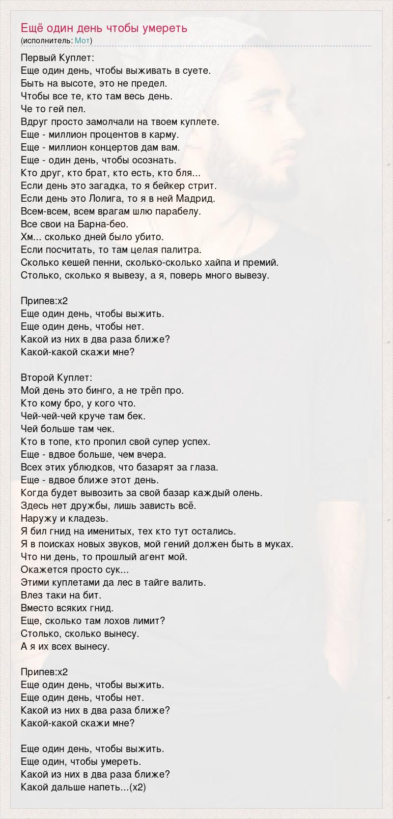 Первый Куплет: Еще один день, чтобы выживать в суете. Быть на высоте, это не предел. Чтобы все те, кто там весь день. Че то гей пел. Вдруг просто замолчали на твоем куплете. Еще - миллион процентов в карму. Еще - миллион концертов дам вам. Еще - один день, чтобы осознать. Кто друг, кто брат, кто есть, кто бля... Если день это загадка, то я бейкер стрит. Если день это Лолига, то я в ней Мадрид. Всем-всем, всем врагам шлю парабелу. Все свои на Барна-бео. Хм... сколько дней было убито. Если посчитать, то там целая палитра. Сколько кешей пенни, сколько-сколько хайпа и премий. Столько, сколько я вывезу, а я, поверь много вывезу. Припев:х2 Еще один день, чтобы выжить. Еще один день, чтобы нет. Какой из них в два раза ближе? Какой-какой скажи мне? Второй Куплет: Мой день это бинго, а не трёп про. Кто кому бро, у кого что. Чей-чей-чей круче там бек. Чей больше там чек. Кто в топе, кто пропил свой супер успех. Еще - вдвое больше, чем вчера. Всех этих ублюдков, что базарят за глаза. Еще - вдвое ближе этот день. Когда будет вывозить за свой базар каждый олень. Здесь нет дружбы, лишь зависть всё. Наружу и кладезь. Я бил гнид на именитых, тех кто тут остались. Я в поисках новых звуков, мой гений должен быть в муках. Что ни день, то прошлый агент мой. Окажется просто сук... Этими куплетами да лес в тайге валить. Влез таки на бит. Вместо всяких гнид. Еще, сколько там лохов лимит? Столько, сколько вынесу. А я их всех вынесу. Припев:х2 Еще один день, чтобы выжить. Еще один день, чтобы нет. Какой из них в два раза ближе? Какой-какой скажи мне? Еще один день, чтобы выжить. Еще один, чтобы умереть. Какой из них в два раза ближе? Какой дальше напеть...(х2)