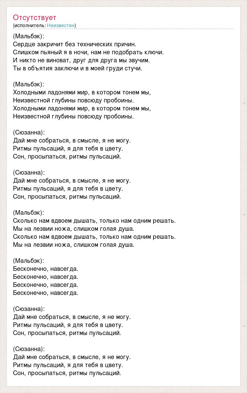 (Мальбэк): Сердце закричит без технических причин. Слишком пьяный я в ночи, нам не подобрать ключи. И никто не виноват, друг для друга мы звучим. Ты в объятия заключи и в моей груди стучи. (Мальбэк): Холодными ладонями мир, в котором тонем мы, Неизвестной глубины повсюду пробоины. Холодными ладонями мир, в котором тонем мы, Неизвестной глубины повсюду пробоины. (Сюзанна): Дай мне собраться, в смысле, я не могу. Ритмы пульсаций, я для тебя в цвету. Сон, просыпаться, ритмы пульсаций. (Сюзанна): Дай мне собраться, в смысле, я не могу. Ритмы пульсаций, я для тебя в цвету. Сон, просыпаться, ритмы пульсаций. (Мальбэк): Сколько нам вдвоем дышать, только нам одним решать. Мы на лезвии ножа, слишком голая душа. Сколько нам вдвоем дышать, только нам одним решать. Мы на лезвии ножа, слишком голая душа. (Мальбэк): Бесконечно, навсегда. Бесконечно, навсегда. Бесконечно, навсегда. Бесконечно, навсегда. (Сюзанна): Дай мне собраться, в смысле, я не могу. Ритмы пульсаций, я для тебя в цвету. Сон, просыпаться, ритмы пульсаций. (Сюзанна): Дай мне собраться, в смысле, я не могу. Ритмы пульсаций, я для тебя в цвету. Сон, просыпаться, ритмы пульсаций.
