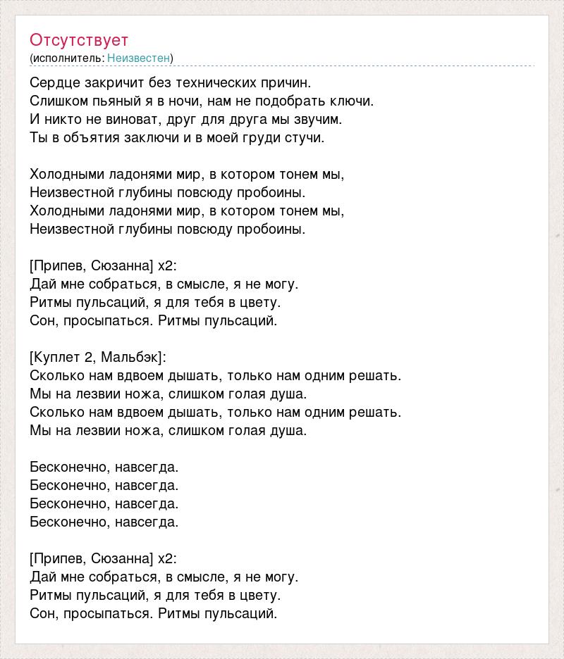 Сердце закричит без технических причин. Слишком пьяный я в ночи, нам не подобрать ключи. И никто не виноват, друг для друга мы звучим. Ты в объятия заключи и в моей груди стучи. Холодными ладонями мир, в котором тонем мы, Неизвестной глубины повсюду пробоины. Холодными ладонями мир, в котором тонем мы, Неизвестной глубины повсюду пробоины. [Припев, Сюзанна] х2: Дай мне собраться, в смысле, я не могу. Ритмы пульсаций, я для тебя в цвету. Сон, просыпаться. Ритмы пульсаций. [Куплет 2, Мальбэк]: Сколько нам вдвоем дышать, только нам одним решать. Мы на лезвии ножа, слишком голая душа. Сколько нам вдвоем дышать, только нам одним решать. Мы на лезвии ножа, слишком голая душа. Бесконечно, навсегда. Бесконечно, навсегда. Бесконечно, навсегда. Бесконечно, навсегда. [Припев, Сюзанна] х2: Дай мне собраться, в смысле, я не могу. Ритмы пульсаций, я для тебя в цвету. Сон, просыпаться. Ритмы пульсаций.