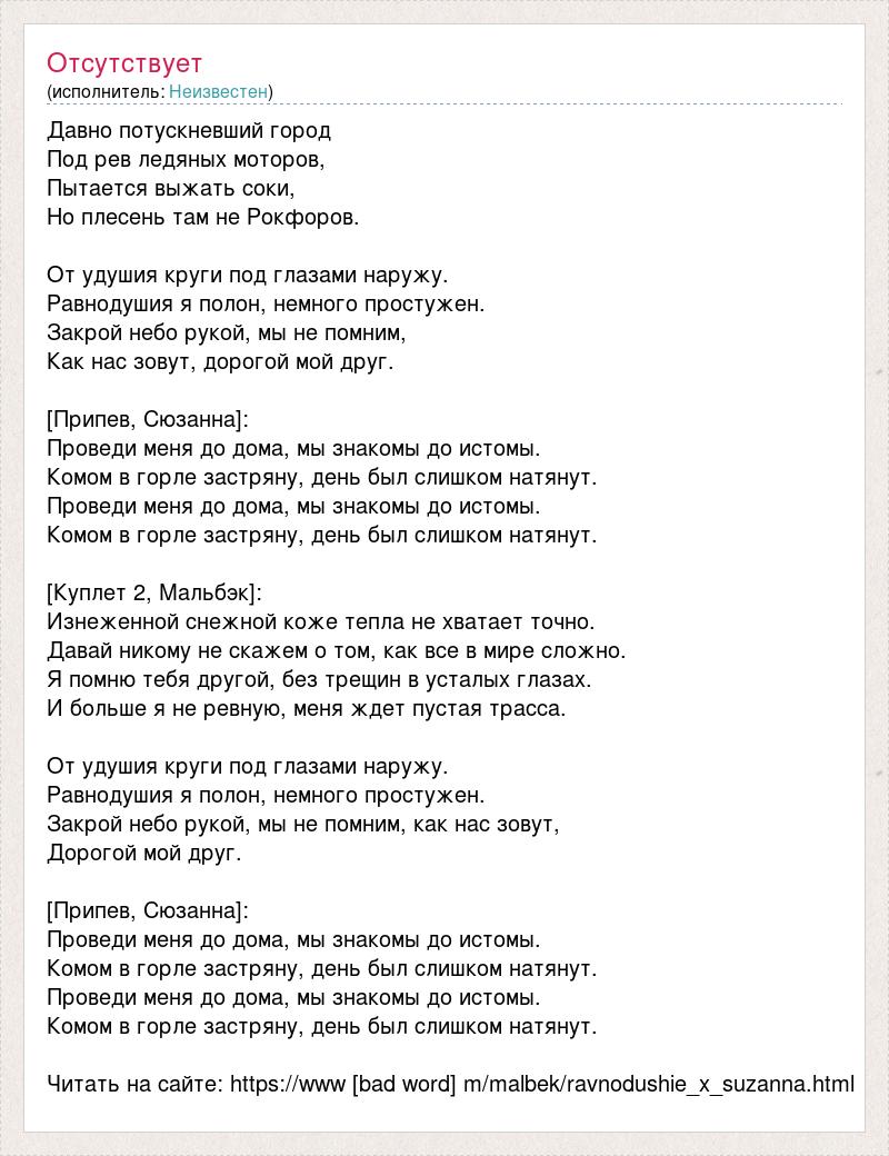Давно потускневший город Под рев ледяных моторов, Пытается выжать соки, Но плесень там не Рокфоров. От удушия круги под глазами наружу. Равнодушия я полон, немного простужен. Закрой небо рукой, мы не помним, Как нас зовут, дорогой мой друг. [Припев, Сюзанна]: Проведи меня до дома, мы знакомы до истомы. Комом в горле застряну, день был слишком натянут. Проведи меня до дома, мы знакомы до истомы. Комом в горле застряну, день был слишком натянут. [Куплет 2, Мальбэк]: Изнеженной снежной коже тепла не хватает точно. Давай никому не скажем о том, как все в мире сложно. Я помню тебя другой, без трещин в усталых глазах. И больше я не ревную, меня ждет пустая трасса. От удушия круги под глазами наружу. Равнодушия я полон, немного простужен. Закрой небо рукой, мы не помним, как нас зовут, Дорогой мой друг. [Припев, Сюзанна]: Проведи меня до дома, мы знакомы до истомы. Комом в горле застряну, день был слишком натянут. Проведи меня до дома, мы знакомы до истомы. Комом в горле застряну, день был слишком натянут. Читать на сайте: https://www [bad word] m/malbek/ravnodushie_x_suzanna.html