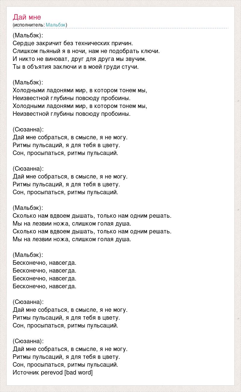 (Мальбэк): Сердце закричит без технических причин. Слишком пьяный я в ночи, нам не подобрать ключи. И никто не виноват, друг для друга мы звучим. Ты в объятия заключи и в моей груди стучи. (Мальбэк): Холодными ладонями мир, в котором тонем мы, Неизвестной глубины повсюду пробоины. Холодными ладонями мир, в котором тонем мы, Неизвестной глубины повсюду пробоины. (Сюзанна): Дай мне собраться, в смысле, я не могу. Ритмы пульсаций, я для тебя в цвету. Сон, просыпаться, ритмы пульсаций. (Сюзанна): Дай мне собраться, в смысле, я не могу. Ритмы пульсаций, я для тебя в цвету. Сон, просыпаться, ритмы пульсаций. (Мальбэк): Сколько нам вдвоем дышать, только нам одним решать. Мы на лезвии ножа, слишком голая душа. Сколько нам вдвоем дышать, только нам одним решать. Мы на лезвии ножа, слишком голая душа. (Мальбэк): Бесконечно, навсегда. Бесконечно, навсегда. Бесконечно, навсегда. Бесконечно, навсегда. (Сюзанна): Дай мне собраться, в смысле, я не могу. Ритмы пульсаций, я для тебя в цвету. Сон, просыпаться, ритмы пульсаций. (Сюзанна): Дай мне собраться, в смысле, я не могу. Ритмы пульсаций, я для тебя в цвету. Сон, просыпаться, ритмы пульсаций. Источник perevod [bad word]