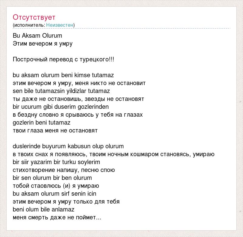 Bu Aksam Olurum Этим вечером я умру Построчный перевод с турецкого!!! bu aksam olurum beni kimse tutamaz этим вечером я умру, меня никто не остановит sen bile tutamazsin yildizlar tutamaz ты даже не остановишь, звезды не остановят bir ucurum gibi duserim gozlerinden в бездну словно я срываюсь у тебя на глазах gozlerin beni tutamaz твои глаза меня не остановят duslerinde buyurum kabusun olup olurum в твоих снах я появляюсь, твоим ночным кошмаром становясь, умираю bir siir yazarim bir turku soylerim стихотворение напишу, песню спою bir sen olurum bir ben olurum тобой стаовлюсь (и) я умираю bu aksam olurum sirf senin icin этим вечером я умру только для тебя beni olum bile anlamaz меня смерть даже не поймет...