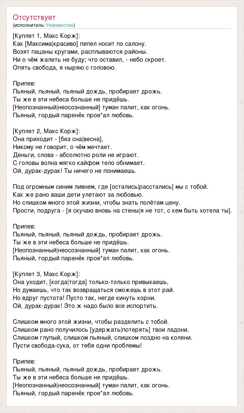[Куплет 1, Макс Корж]: Как [Максима|красиво] пепел носит по салону. Возят пацаны кругами, расплываются районы. Ни о чём жалеть не буду; что оставил, - небо скроет. Опять свобода, я ныряю с головою. Припев: Пьяный, пьяный, пьяный дождь, пробирает дрожь. Ты же в эти небеса больше не придёшь. [Неопознанный|неосознанный] туман палит, как огонь. Пьяный, гордый паренёк прое*ал любовь. [Куплет 2, Макс Корж]: Она приходит - [без сна|весна], Никому не говорит, о чём мечтает. Деньги, слова - абсолютно роли не играют. С головы волна мягко кайфом тело обнимает. Ой, дурак-дурак! Ты ничего не понимаешь. Под огромным синим ливнем, где [остались|расстались] мы с тобой. Как же рано ваши дети улетают за любовью. Но слишком много этой жизни, чтобы знать полётам цену. Прости, подруга - [я скучаю вновь на стены|я не тот, с кем быть хотела ты]. Припев: Пьяный, пьяный, пьяный дождь, пробирает дрожь. Ты же в эти небеса больше не придёшь. [Неопознанный|неосознанный] туман палит, как огонь. Пьяный, гордый паренёк прое*ал любовь. [Куплет 3, Макс Корж]: Она уходит, [когда|тогда] только-только привыкаешь, Но думаешь, что так возвращаться сможешь в этот рай. Но вдруг пустота! Пусто так, негде кинуть корни. Ой, дурак-дурак! Это ж надо было все испортить. Слишком много этой жизни, чтобы разделить с тобой. Слишком рано получилось [удержать|потерять] твои ладони. Слишком глупый, слишком пьяный, слишком поздно на колени. Пусти свобода-сука, от тебя одни проблемы! Припев: Пьяный, пьяный, пьяный дождь, пробирает дрожь. Ты же в эти небеса больше не придёшь. [Неопознанный|неосознанный] туман палит, как огонь. Пьяный, гордый паренёк прое*ал любовь.