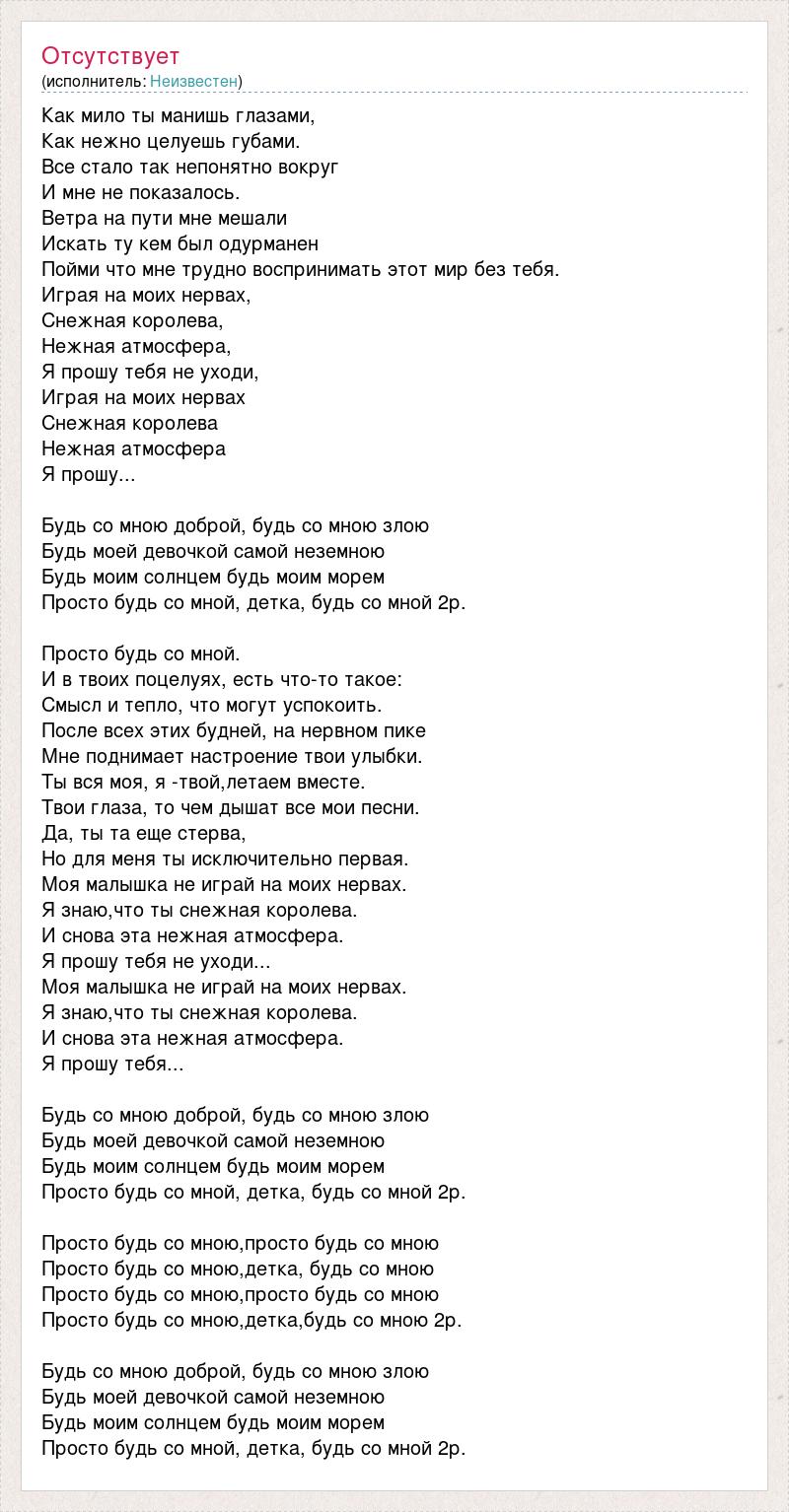 Как мило ты манишь глазами, Как нежно целуешь губами. Все стало так непонятно вокруг И мне не показалось. Ветра на пути мне мешали Искать ту кем был одурманен Пойми что мне трудно воспринимать этот мир без тебя. Играя на моих нервах, Снежная королева, Нежная атмосфера, Я прошу тебя не уходи, Играя на моих нервах Снежная королева Нежная атмосфера Я прошу... Будь со мною доброй, будь со мною злою Будь моей девочкой самой неземною Будь моим солнцем будь моим морем Просто будь со мной, детка, будь со мной 2р. Просто будь со мной. И в твоих поцелуях, есть что-то такое: Смысл и тепло, что могут успокоить. После всех этих будней, на нервном пике Мне поднимает настроение твои улыбки. Ты вся моя, я -твой,летаем вместе. Твои глаза, то чем дышат все мои песни. Да, ты та еще стерва, Но для меня ты исключительно первая. Моя малышка не играй на моих нервах. Я знаю,что ты снежная королева. И снова эта нежная атмосфера. Я прошу тебя не уходи... Моя малышка не играй на моих нервах. Я знаю,что ты снежная королева. И снова эта нежная атмосфера. Я прошу тебя... Будь со мною доброй, будь со мною злою Будь моей девочкой самой неземною Будь моим солнцем будь моим морем Просто будь со мной, детка, будь со мной 2р. Просто будь со мною,просто будь со мною Просто будь со мною,детка, будь со мною Просто будь со мною,просто будь со мною Просто будь со мною,детка,будь со мною 2р. Будь со мною доброй, будь со мною злою Будь моей девочкой самой неземною Будь моим солнцем будь моим морем Просто будь со мной, детка, будь со мной 2р.