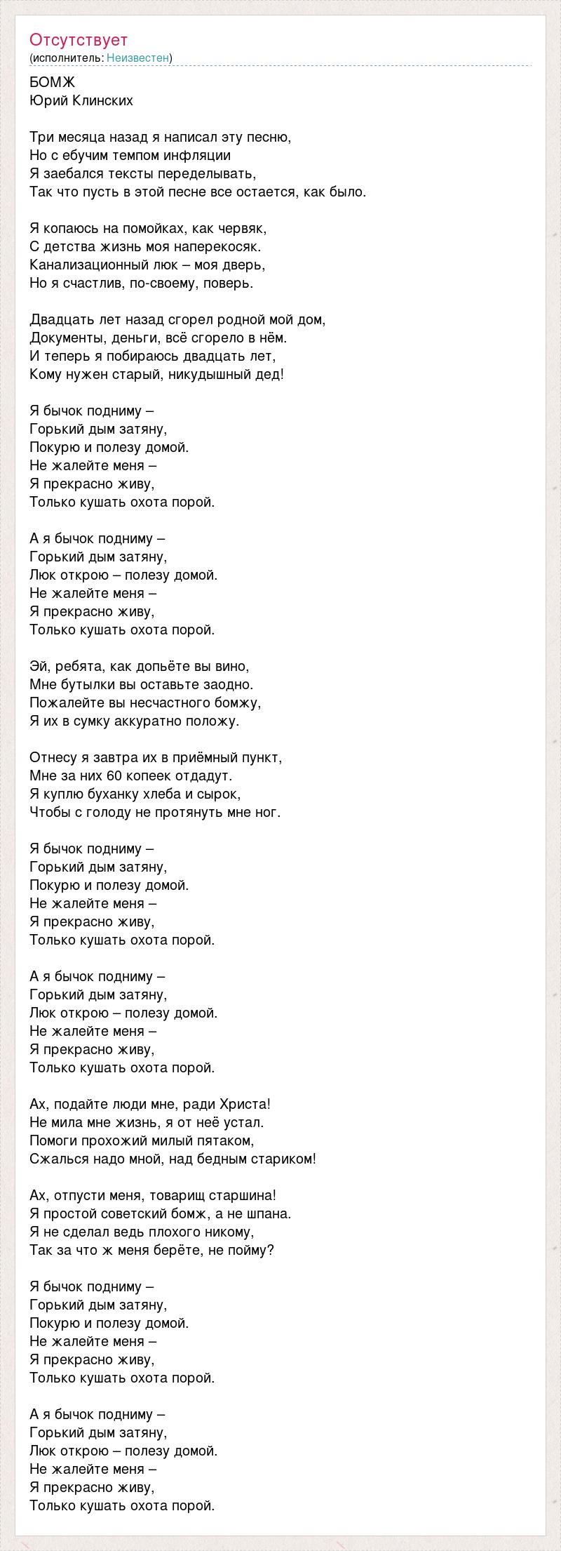 БОМЖ Юрий Клинских Три месяца назад я написал эту песню, Но с ебучим темпом инфляции Я заебался тексты переделывать, Так что пусть в этой песне все остается, как было. Я копаюсь на помойках, как червяк, С детства жизнь моя наперекосяк. Канализационный люк – моя дверь, Но я счастлив, по-своему, поверь. Двадцать лет назад сгорел родной мой дом, Документы, деньги, всё сгорело в нём. И теперь я побираюсь двадцать лет, Кому нужен старый, никудышный дед! Я бычок подниму – Горький дым затяну, Покурю и полезу домой. Не жалейте меня – Я прекрасно живу, Только кушать охота порой. А я бычок подниму – Горький дым затяну, Люк открою – полезу домой. Не жалейте меня – Я прекрасно живу, Только кушать охота порой. Эй, ребята, как допьёте вы вино, Мне бутылки вы оставьте заодно. Пожалейте вы несчастного бомжу, Я их в сумку аккуратно положу. Отнесу я завтра их в приёмный пункт, Мне за них 60 копеек отдадут. Я куплю буханку хлеба и сырок, Чтобы с голоду не протянуть мне ног. Я бычок подниму – Горький дым затяну, Покурю и полезу домой. Не жалейте меня – Я прекрасно живу, Только кушать охота порой. А я бычок подниму – Горький дым затяну, Люк открою – полезу домой. Не жалейте меня – Я прекрасно живу, Только кушать охота порой. Ах, подайте люди мне, ради Христа! Не мила мне жизнь, я от неё устал. Помоги прохожий милый пятаком, Сжалься надо мной, над бедным стариком! Ах, отпусти меня, товарищ старшина! Я простой советский бомж, а не шпана. Я не сделал ведь плохого никому, Так за что ж меня берёте, не пойму? Я бычок подниму – Горький дым затяну, Покурю и полезу домой. Не жалейте меня – Я прекрасно живу, Только кушать охота порой. А я бычок подниму – Горький дым затяну, Люк открою – полезу домой. Не жалейте меня – Я прекрасно живу, Только кушать охота порой.