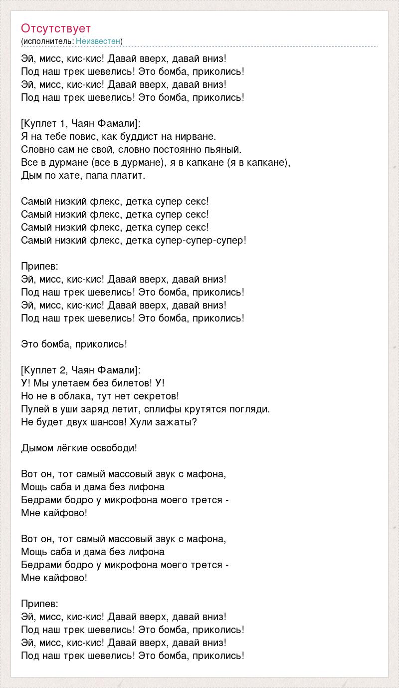 Эй, мисс, кис-кис! Давай вверх, давай вниз! Под наш трек шевелись! Это бомба, приколись! Эй, мисс, кис-кис! Давай вверх, давай вниз! Под наш трек шевелись! Это бомба, приколись! [Куплет 1, Чаян Фамали]: Я на тебе повис, как буддист на нирване. Словно сам не свой, словно постоянно пьяный. Все в дурмане (все в дурмане), я в капкане (я в капкане), Дым по хате, папа платит. Самый низкий флекс, детка супер секс! Самый низкий флекс, детка супер секс! Самый низкий флекс, детка супер секс! Самый низкий флекс, детка супер-супер-супер! Припев: Эй, мисс, кис-кис! Давай вверх, давай вниз! Под наш трек шевелись! Это бомба, приколись! Эй, мисс, кис-кис! Давай вверх, давай вниз! Под наш трек шевелись! Это бомба, приколись! Это бомба, приколись! [Куплет 2, Чаян Фамали]: У! Мы улетаем без билетов! У! Но не в облака, тут нет секретов! Пулей в уши заряд летит, сплифы крутятся погляди. Не будет двух шансов! Хули зажаты? Дымом лёгкие освободи! Вот он, тот самый массовый звук с мафона, Мощь саба и дама без лифона Бедрами бодро у микрофона моего трется - Мне кайфово! Вот он, тот самый массовый звук с мафона, Мощь саба и дама без лифона Бедрами бодро у микрофона моего трется - Мне кайфово! Припев: Эй, мисс, кис-кис! Давай вверх, давай вниз! Под наш трек шевелись! Это бомба, приколись! Эй, мисс, кис-кис! Давай вверх, давай вниз! Под наш трек шевелись! Это бомба, приколись!