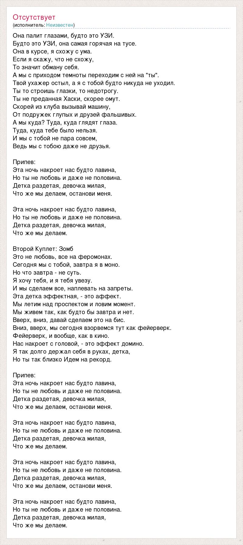Она палит глазами, будто это УЗИ. Будто это УЗИ, она самая горячая на тусе. Она в курсе, я схожу с ума. Если я скажу, что не схожу, То значит обману себя. А мы с приходом темноты переходим с ней на "ты". Твой ухажер остыл, а я с тобой будто никуда не уходил. Ты то строишь глазки, то недотрогу. Ты не преданная Хаски, скорее омут. Скорей из клуба вызывай машину, От подружек глупых и друзей фальшивых. А мы куда? Туда, куда глядят глаза. Туда, куда тебе было нельзя. И мы с тобой не пара совсем, Ведь мы с тобою даже не друзья. Припев: Эта ночь накроет нас будто лавина, Но ты не любовь и даже не половина. Детка раздетая, девочка милая, Что же мы делаем, останови меня. Эта ночь накроет нас будто лавина, Но ты не любовь и даже не половина. Детка раздетая, девочка милая, Что же мы делаем. Второй Куплет: Зомб Это не любовь, все на феромонах. Сегодня мы с тобой, завтра я в моно. Но что завтра - не суть. Я хочу тебя, и я тебя увезу. И мы сделаем все, наплевать на запреты. Эта детка эффектная, - это аффект. Мы летим над проспектом и ловим момент. Мы живем так, как будто бы завтра и нет. Вверх, вниз, давай сделаем это на бис. Вниз, вверх, мы сегодня взорвемся тут как фейерверк. Фейерверк, и вообще, как в кино. Нас накроет с головой, - это эффект домино. Я так долго держал себя в руках, детка, Но ты так близко Идем на рекорд. Припев: Эта ночь накроет нас будто лавина, Но ты не любовь и даже не половина. Детка раздетая, девочка милая, Что же мы делаем, останови меня. Эта ночь накроет нас будто лавина, Но ты не любовь и даже не половина. Детка раздетая, девочка милая, Что же мы делаем. Эта ночь накроет нас будто лавина, Но ты не любовь и даже не половина. Детка раздетая, девочка милая, Что же мы делаем, останови меня. Эта ночь накроет нас будто лавина, Но ты не любовь и даже не половина. Детка раздетая, девочка милая, Что же мы делаем.