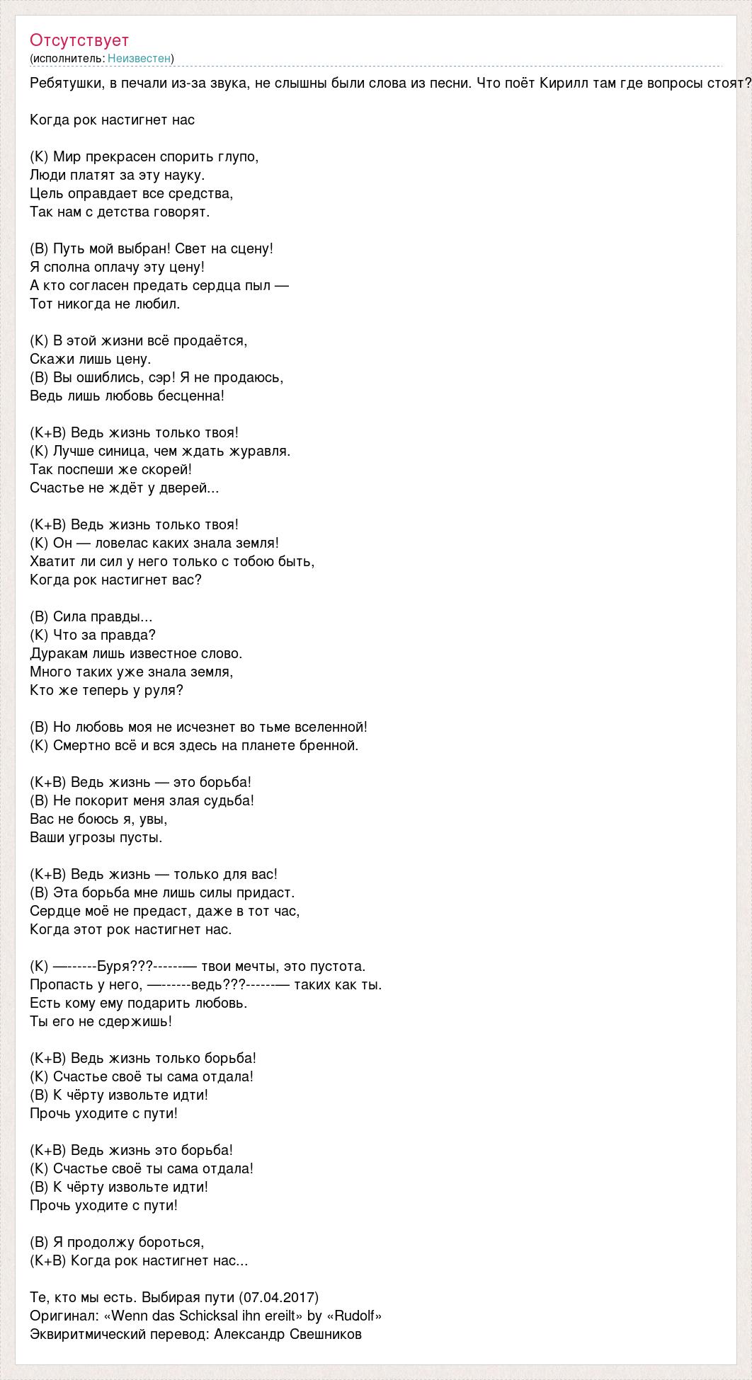 Ребятушки, в печали из-за звука, не слышны были слова из песни. Что поёт Кирилл там где вопросы стоят? Когда рок настигнет нас (К) Мир прекрасен спорить глупо, Люди платят за эту науку. Цель оправдает все средства, Так нам с детства говорят. (В) Путь мой выбран! Свет на сцену! Я сполна оплачу эту цену! А кто согласен предать сердца пыл — Тот никогда не любил. (К) В этой жизни всё продаётся, Скажи лишь цену. (В) Вы ошиблись, сэр! Я не продаюсь, Ведь лишь любовь бесценна! (К+В) Ведь жизнь только твоя! (К) Лучше синица, чем ждать журавля. Так поспеши же скорей! Счастье не ждёт у дверей... (К+В) Ведь жизнь только твоя! (К) Он — ловелас каких знала земля! Хватит ли сил у него только с тобою быть, Когда рок настигнет вас? (В) Сила правды... (К) Что за правда? Дуракам лишь известное слово. Много таких уже знала земля, Кто же теперь у руля? (В) Но любовь моя не исчезнет во тьме вселенной! (К) Смертно всё и вся здесь на планете бренной. (К+В) Ведь жизнь — это борьба! (В) Не покорит меня злая судьба! Вас не боюсь я, увы, Ваши угрозы пусты. (К+В) Ведь жизнь — только для вас! (В) Эта борьба мне лишь силы придаст. Сердце моё не предаст, даже в тот час, Когда этот рок настигнет нас. (К) —------Буря???------— твои мечты, это пустота. Пропасть у него, —------ведь???------— таких как ты. Есть кому ему подарить любовь. Ты его не сдержишь! (К+В) Ведь жизнь только борьба! (К) Счастье своё ты сама отдала! (В) К чёрту извольте идти! Прочь уходите с пути! (К+В) Ведь жизнь это борьба! (К) Счастье своё ты сама отдала! (В) К чёрту извольте идти! Прочь уходите с пути! (В) Я продолжу бороться, (К+В) Когда рок настигнет нас... Те, кто мы есть. Выбирая пути (07.04.2017) Оригинал: «Wenn das Schicksal ihn ereilt» by «Rudolf» Эквиритмический перевод: Александр Свешников