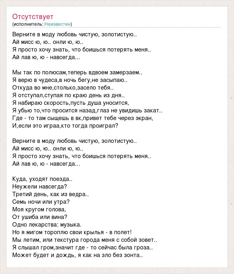 Верните в моду любовь чистую, золотистую.. Ай мисс ю, ю.. онли ю, ю.. Я просто хочу знать, что боишься потерять меня.. Ай лав ю, ю - навсегда... Мы так по полюсам,теперь вдвоем замерзаем.. Я верю в чудеса,в ночь бегу,не засыпаю.. Откуда во мне,столько,засело тебя.. Я отступал,ступая по краю день из дня.. Я набираю скорость,пусть душа уносится, Я убью то,что просится назад,глаз не увидишь закат.. Где - то там сыщешь в вк,привет тебе через экран, И,если это играа,кто тогда проиграл? Верните в моду любовь чистую, золотистую.. Ай мисс ю, ю.. онли ю, ю.. Я просто хочу знать, что боишься потерять меня.. Ай лав ю, ю - навсегда... Куда, уходят поезда.. Неужели навсегда? Третий день, как из ведра.. Семь ночи или утра? Моя кругом голова, От ушиба или вина? Одно лекарства: музыка. Но я мигом тороплю свои крылья - в полет! Мы летим, или текстура города меня с собой зовет.. Я слышал гром,значит где - то сейчас была гроза.. Может будет и дождь, я как на зло без зонта..